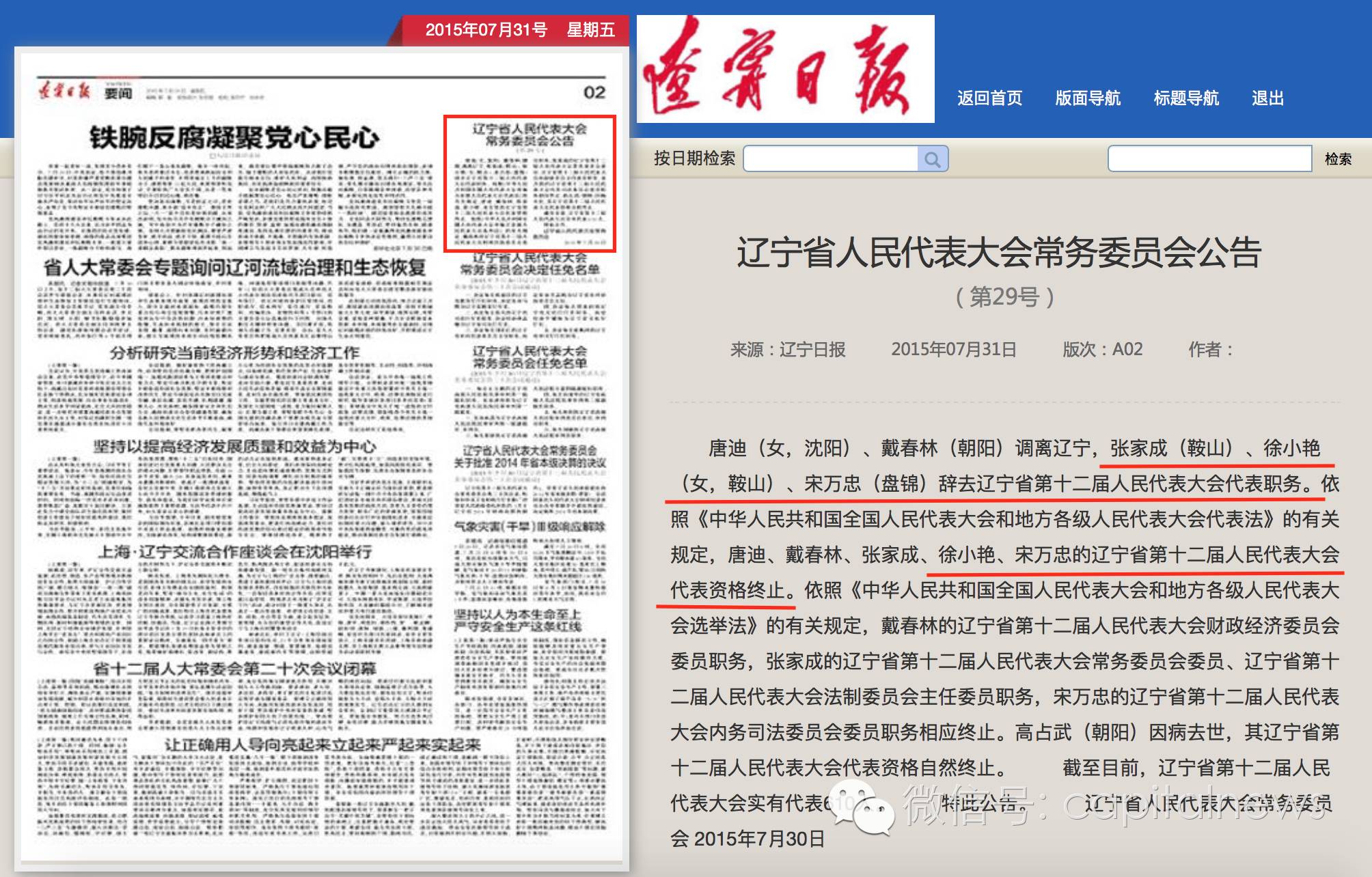 其實早在2015年7月30日,遼寧省人大常委會就已經發布公告,宣布徐小艷的省人大代表資格終止。