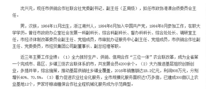 這種公示通常有個格式:“簡歷+擬任職務+曾任職務”:公示對象的性別、年齡、籍貫、學歷、現任職務、擬任職務等,過去的政績幾乎沒有介紹。