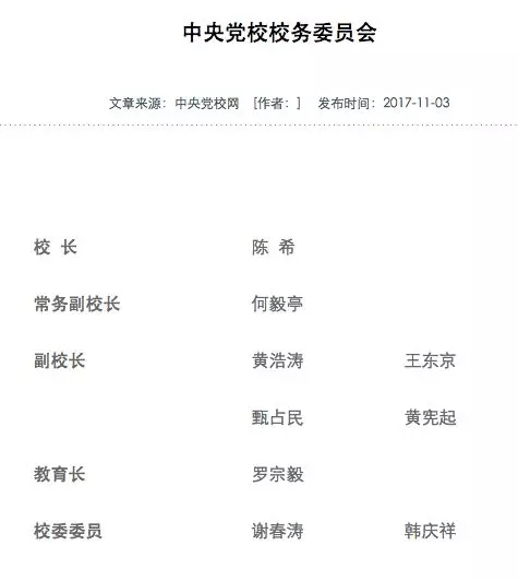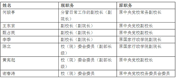 《學(xué)習(xí)時(shí)報(bào)》披露的中央黨校(國(guó)家行政學(xué)院)的領(lǐng)導(dǎo)班子成員共7人,其中,何毅亭、王東京、甄占民、黃憲起、謝春濤5人此前任職于原中央黨校,李季、陳立2人此前任職于原國(guó)家行政學(xué)院。