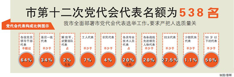 按照市委十一屆十二次全會決定,溫州市第十二次黨代會將于2017年2月召開。據(jù)悉,此次黨代會代表名額定為538名,將根據(jù)各地所轄黨組織的數(shù)量、黨員人數(shù)和工作需要確定名額分配,人選資格條件由多部門集中聯(lián)審,從嚴(yán)把關(guān),嚴(yán)防“帶病當(dāng)選”。
