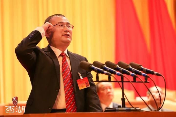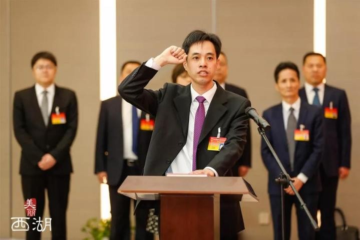 大會舉行了憲法宣誓儀式,新當選的西湖區人民政府區長、西湖區人大常委會副主任、西湖區人大常委會委員、西湖區監委主任依次宣誓。