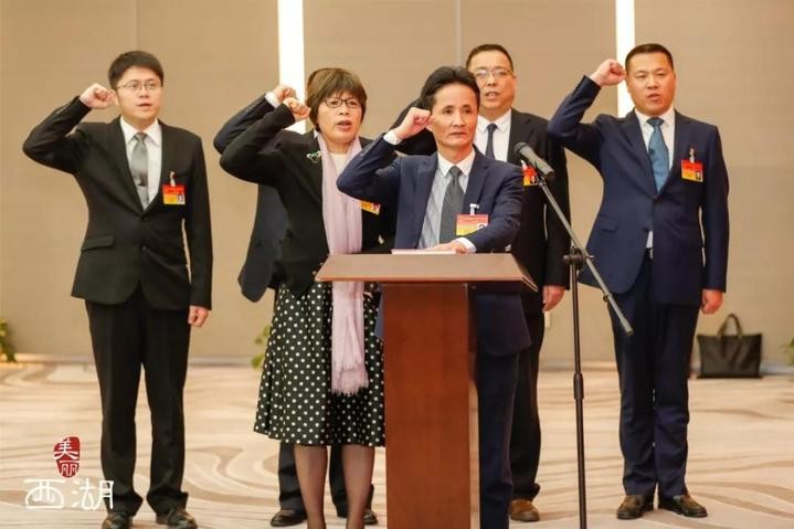 西湖區人大常委會副主任 張利群、鄭國梅,西湖區人大常委會委員丁元洪、方曉平、周志明、徐浩哲宣誓
