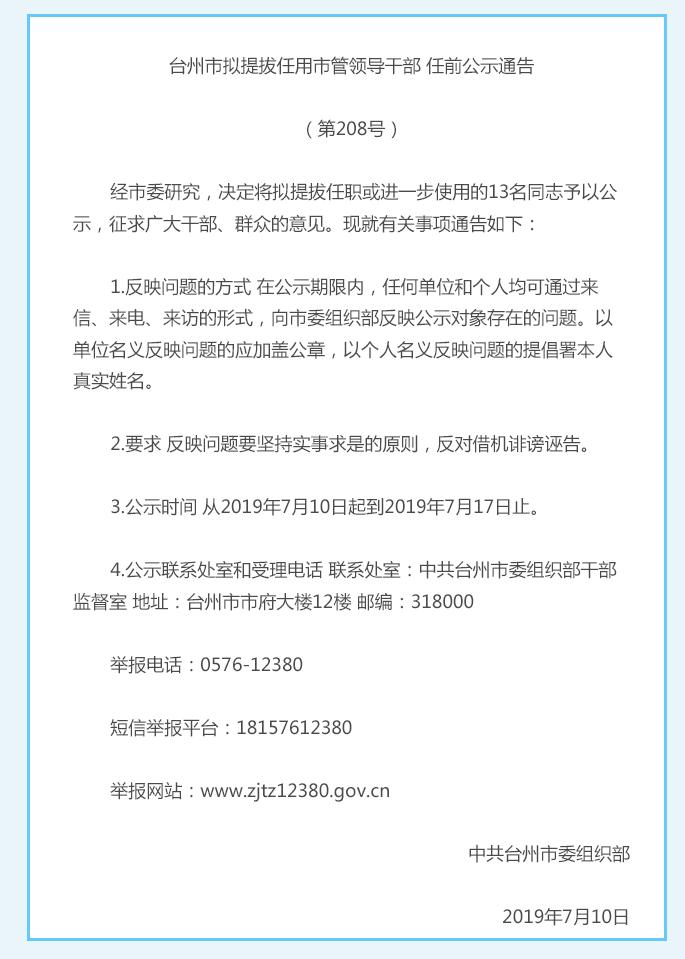 7月11日的《臺州日報》,發布了臺州市擬提拔任用13名市管領導干部的任前公示通告。