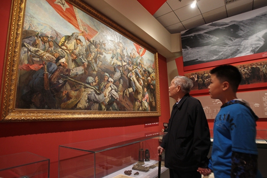 9月28日,北京,中國人民革命軍事博物館,民眾紛紛觀看《紀念中國工農紅軍長征勝利80周年主題展》。這是展出的油畫《三大主力會師》。李葛/視覺中國