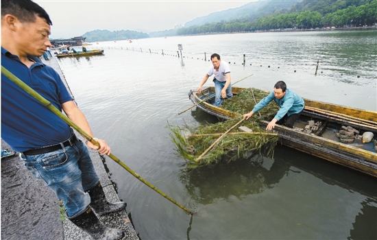 5月28日,杭州西湖景區的園林工人把準備好的水草分批投入北里湖種植區。引種的水草成活后,可起到改善水質的作用。
