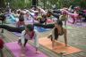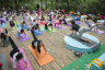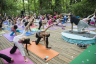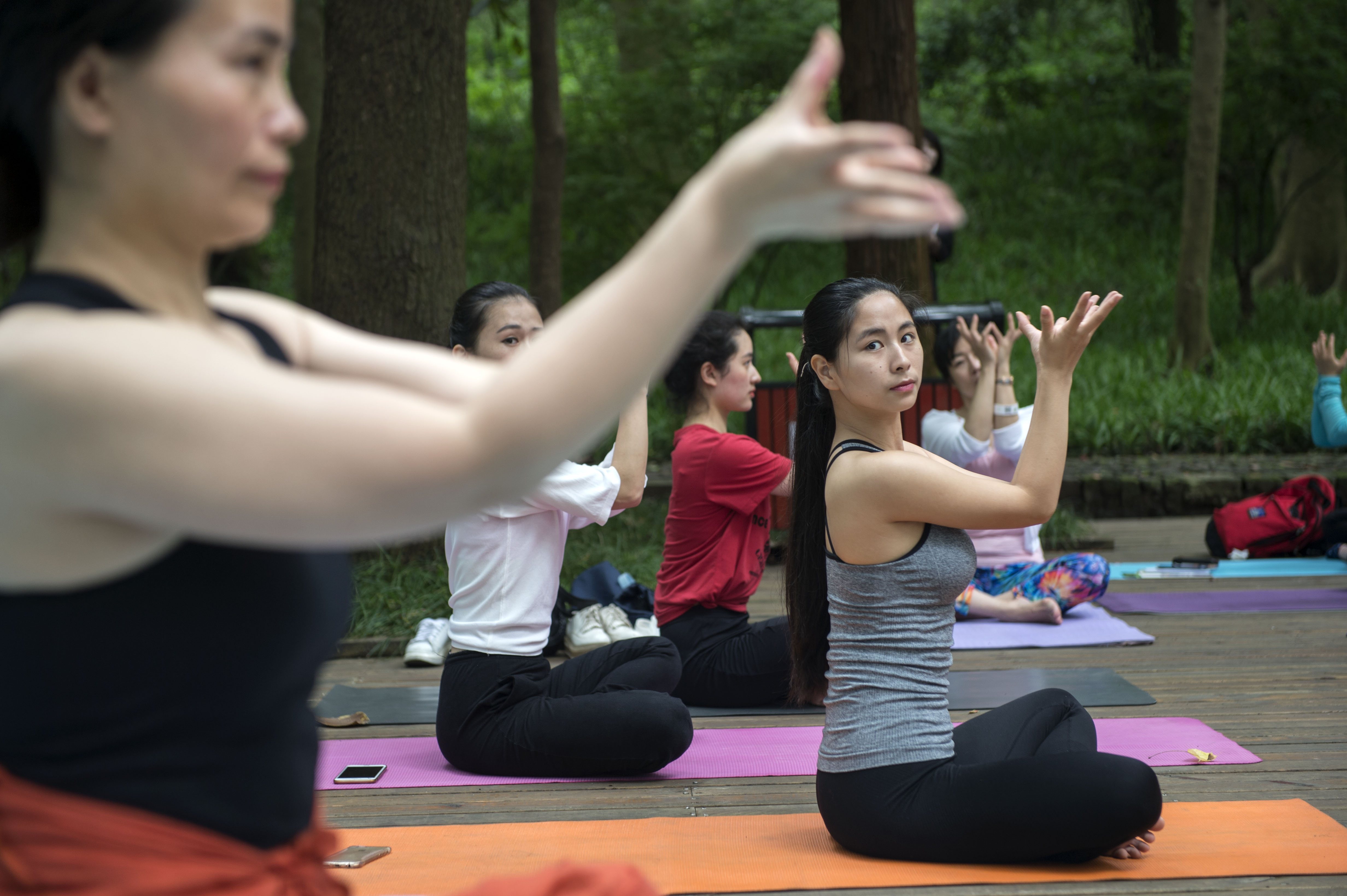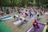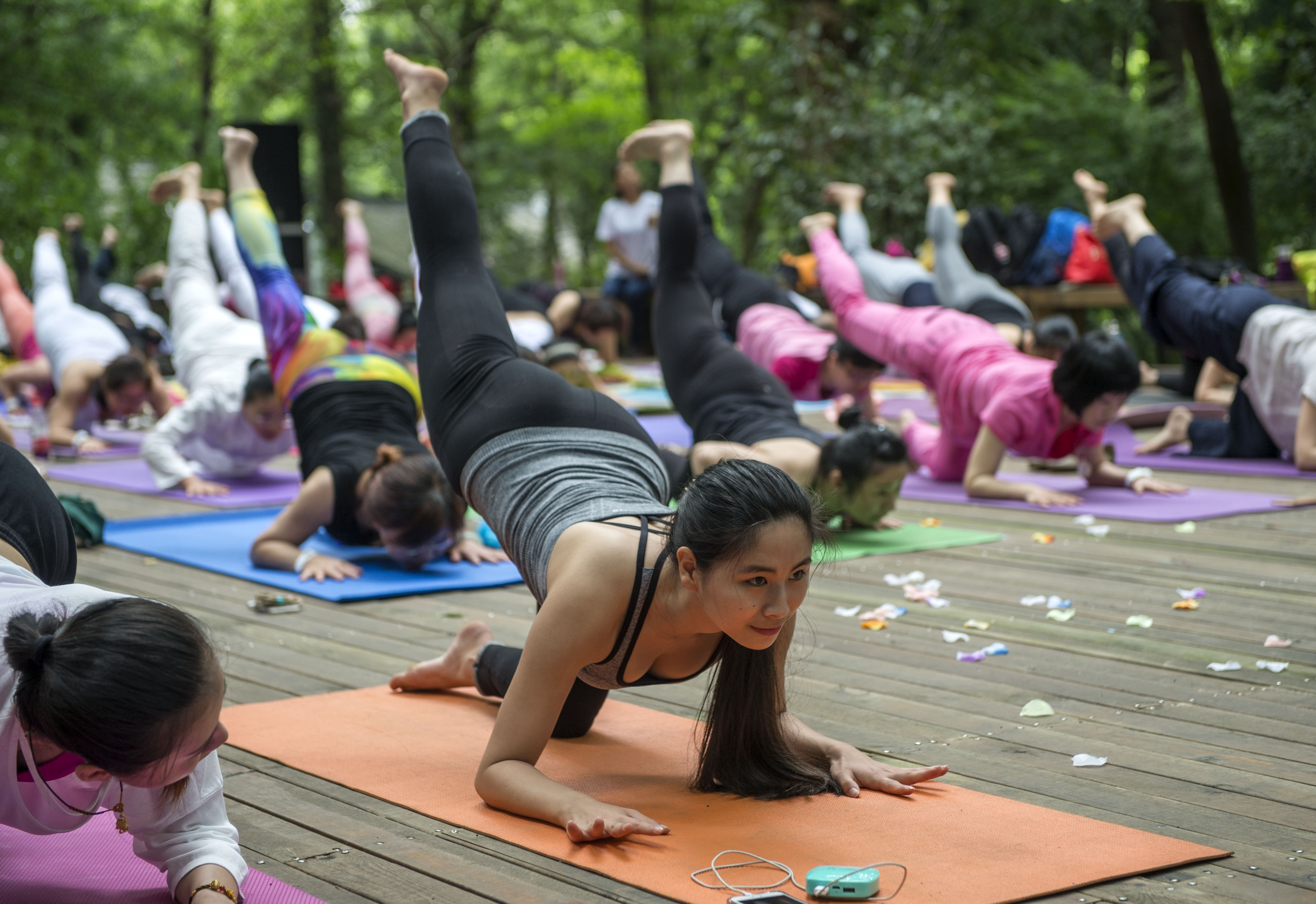 6月19日,杭州虎跑公園舉行“森林瑜伽”展示活動,近百名瑜伽愛好者遠離城市的喧囂以及PM2.5,在300平米的室外平臺上舒展身心,聆聽潺潺泉水聲,與蔥郁山林渾然一體,十分愜意。