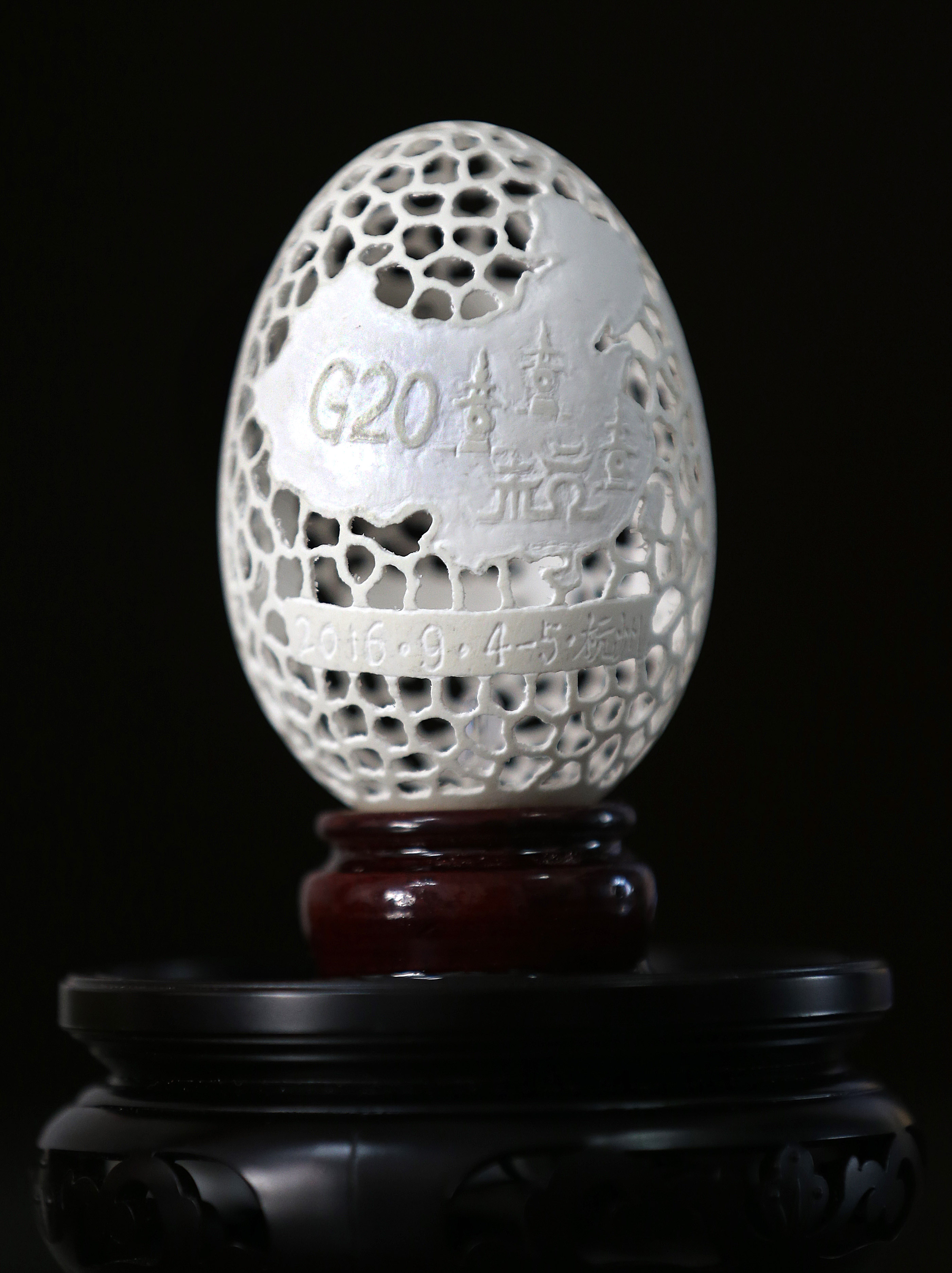 浙江黨建網訊(浙江日報記者 林云龍 攝)7月5日,在杭州九堡金海社區,曾火生展示他的G20蛋雕系列作品。60歲的曾火生以刻刀為筆,在輕薄易碎的蛋殼上雕刻出了一幅幅美麗的圖案,甚至還運用高難度的鏤空雕刻技術在白色的鵝蛋上刻出了精美絕倫的“蕾絲蛋”。為了迎接即將到來的G20,他特地創作了以此為主題的蛋雕系列作品。