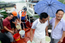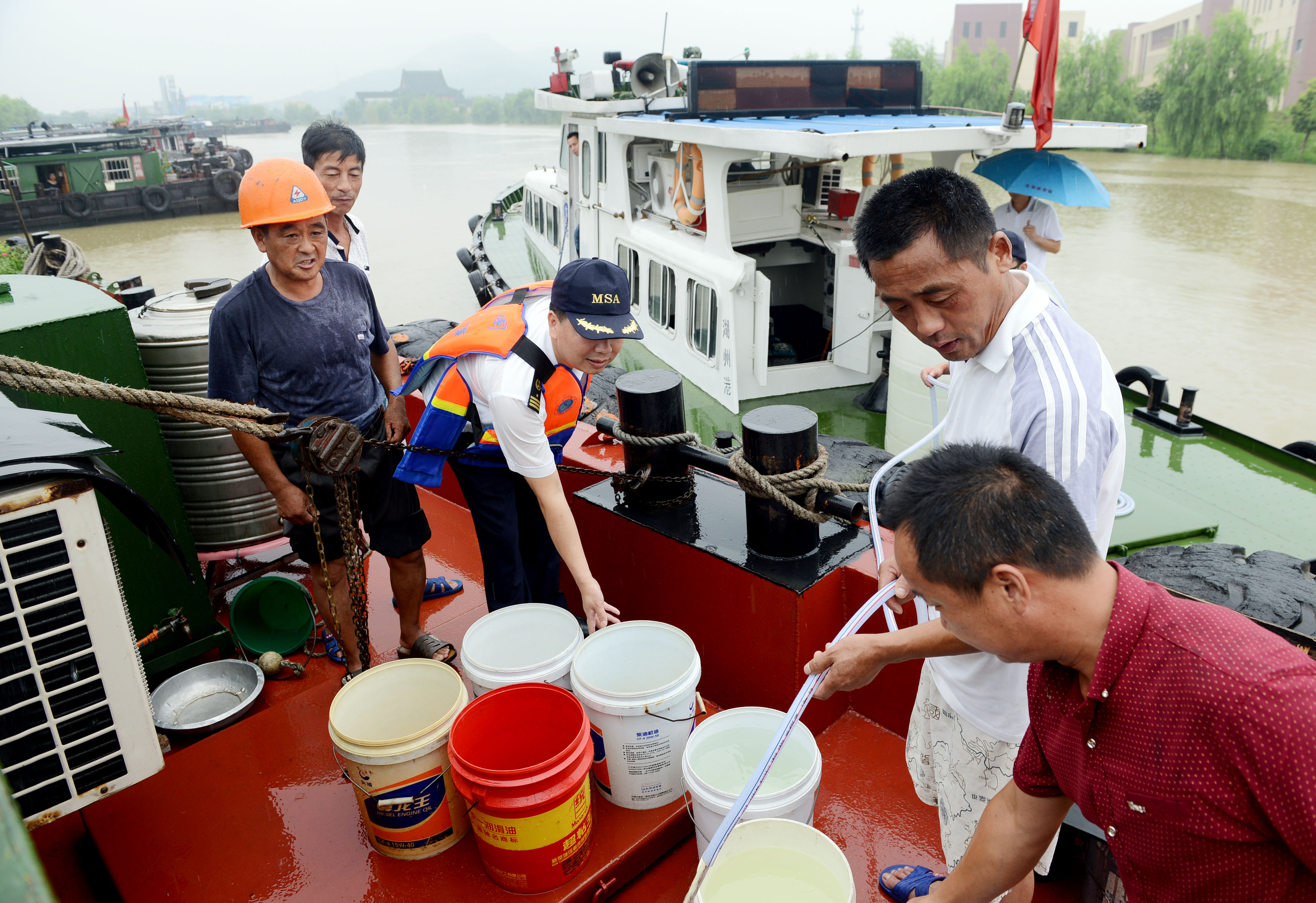 7月7日,在長湖申線湖州七里亭段,湖州港航人員巡查航道途中,為滯留船民免費提供生活用水。