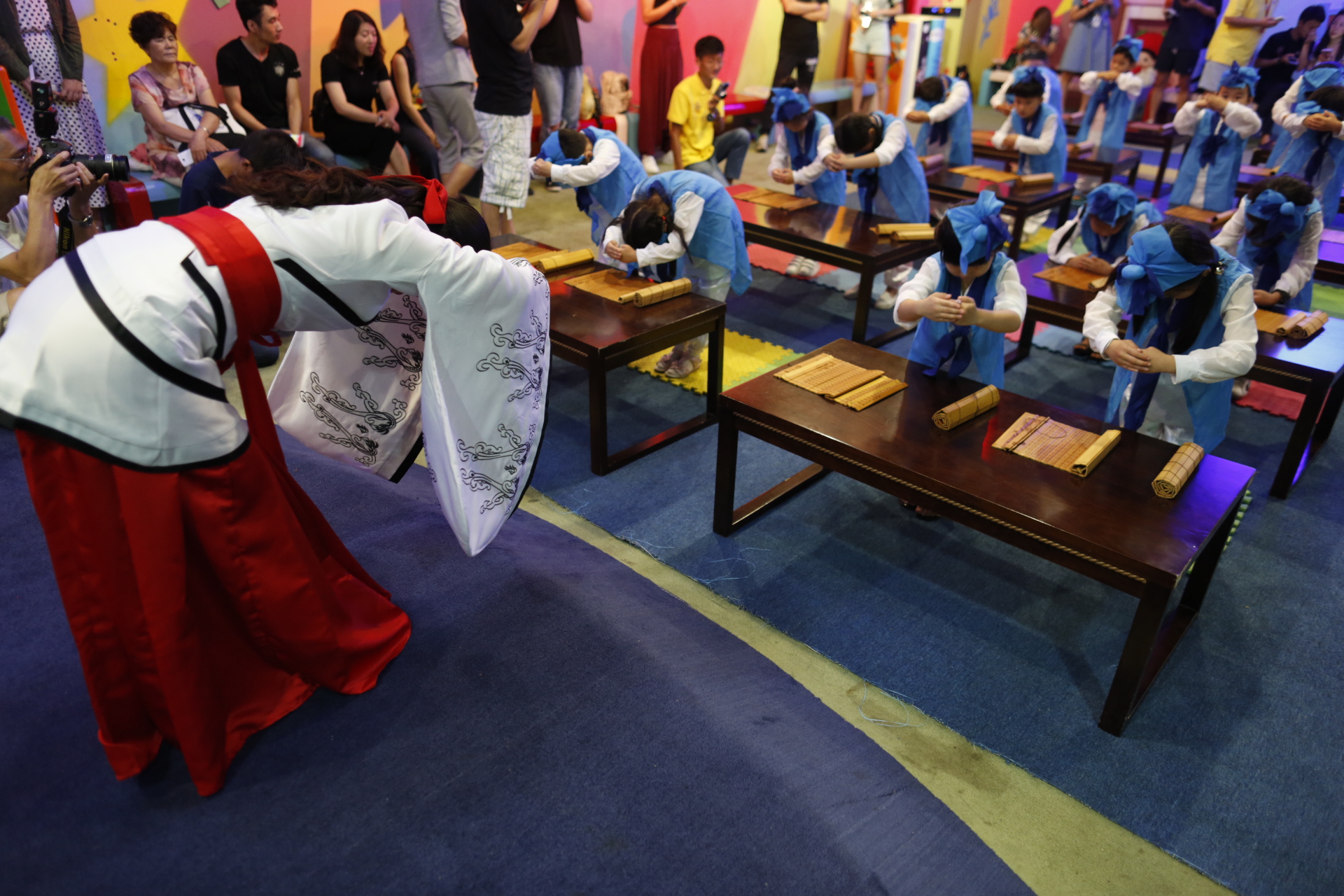 浙江黨建網(wǎng)訊(浙江日報記者 朱衛(wèi)國 攝)7月13日,暑期來臨,杭州爛蘋果樂園熱鬧了起來,適逢國學(xué)夏令營少兒主播大賽開幕,幾十名萌娃穿上漢服學(xué)習(xí)古代禮儀,體驗傳統(tǒng)文化。