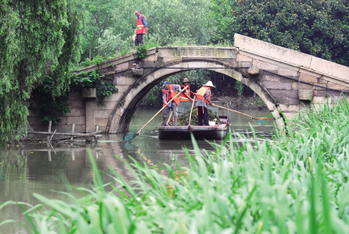 浙江黨建網訊7月14日,秀洲區洪合鎮良三村的河道內,數名保潔員正在進行打撈水草、垃圾等日常保潔工作。經過長期的“五水共治”,河道水質都有所改善。(李佳偉 攝)