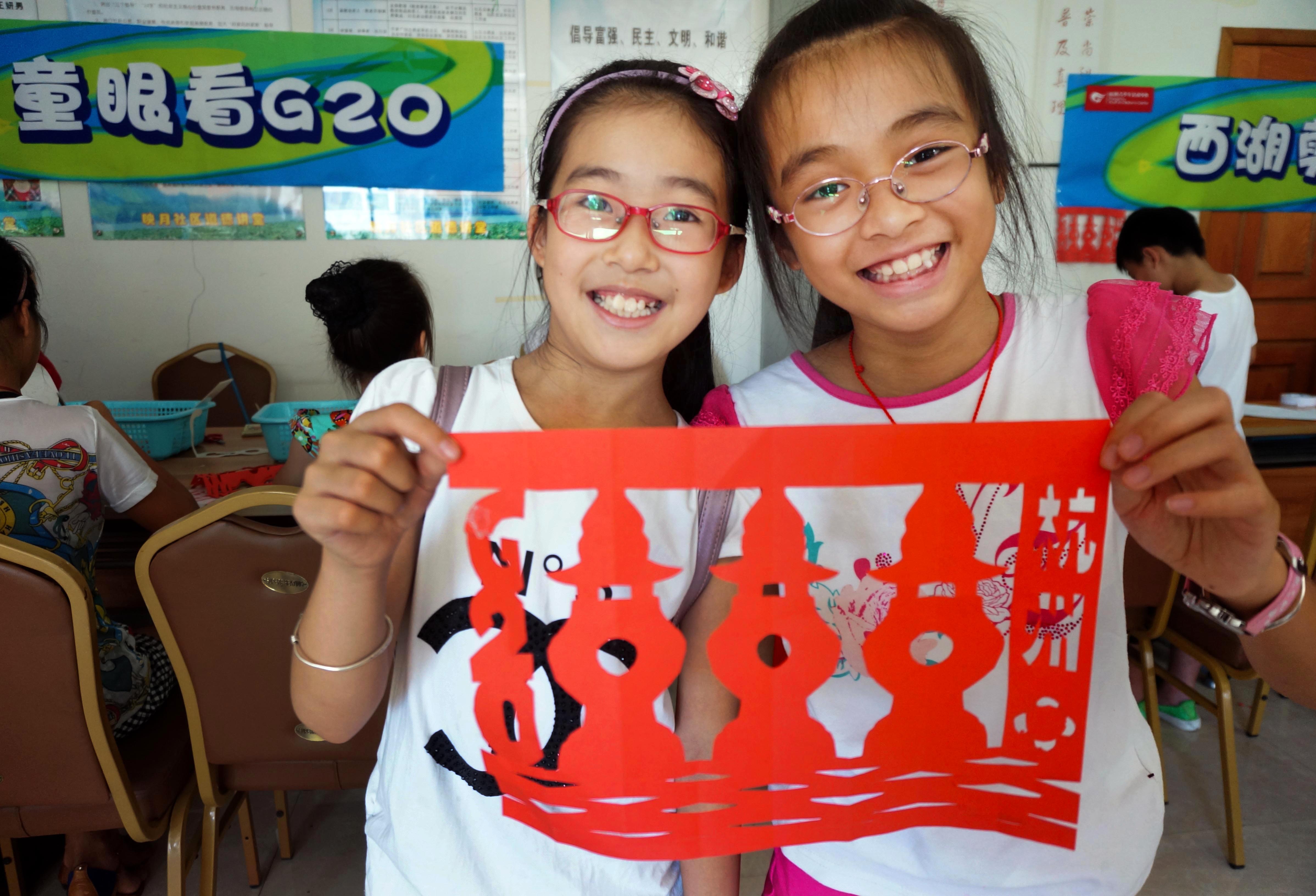 兩位小朋友拿起剪好G20·西湖三潭印月剪紙,開心不已。