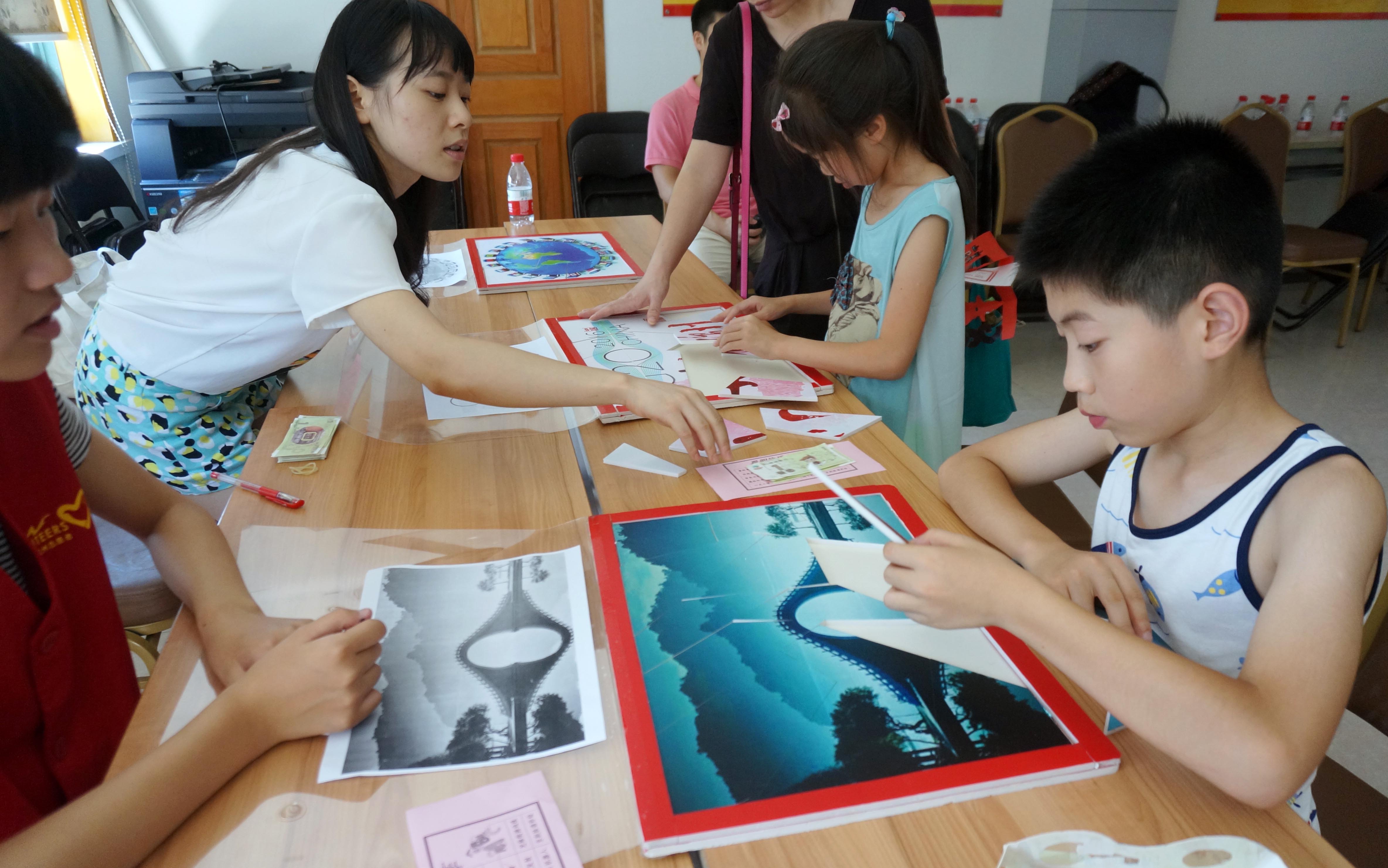 小朋友們正在玩西湖拼圖。