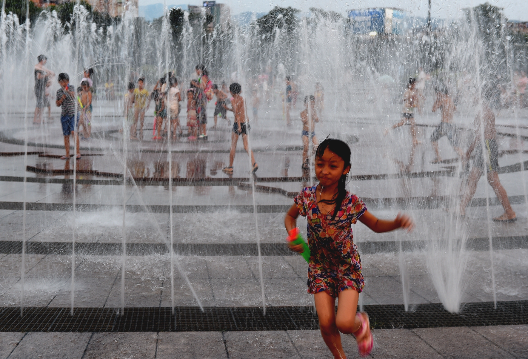 浙江黨建網訊7月25日,不少孩子在義烏繡湖廣場噴泉處嬉水降溫。當日,氣象臺繼續發布高溫橙色預警信號:受副熱帶高壓控制,義烏最高氣溫達到39℃,局部40℃。(龔獻明 攝)
