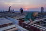 迎著晚霞錯時施工