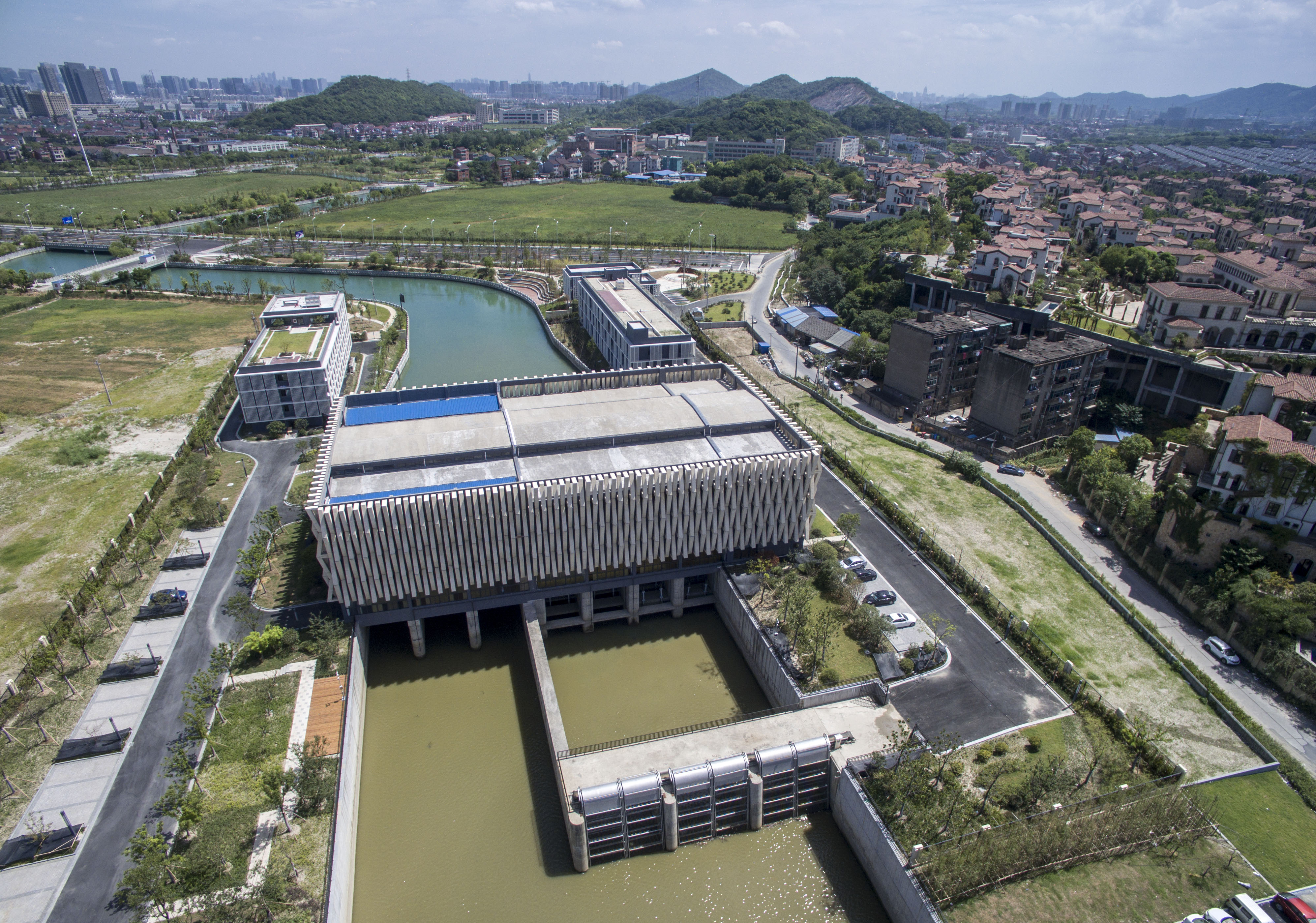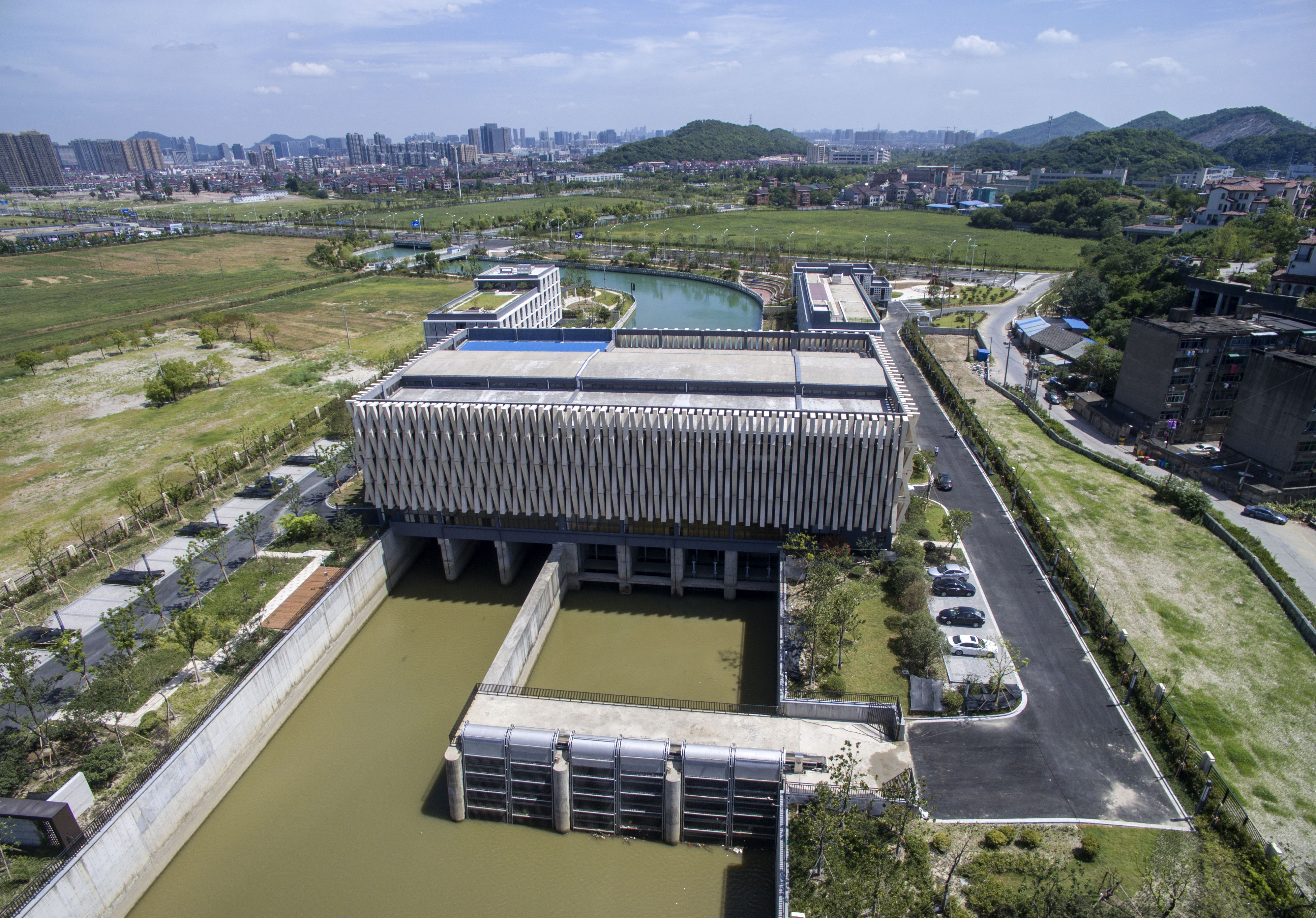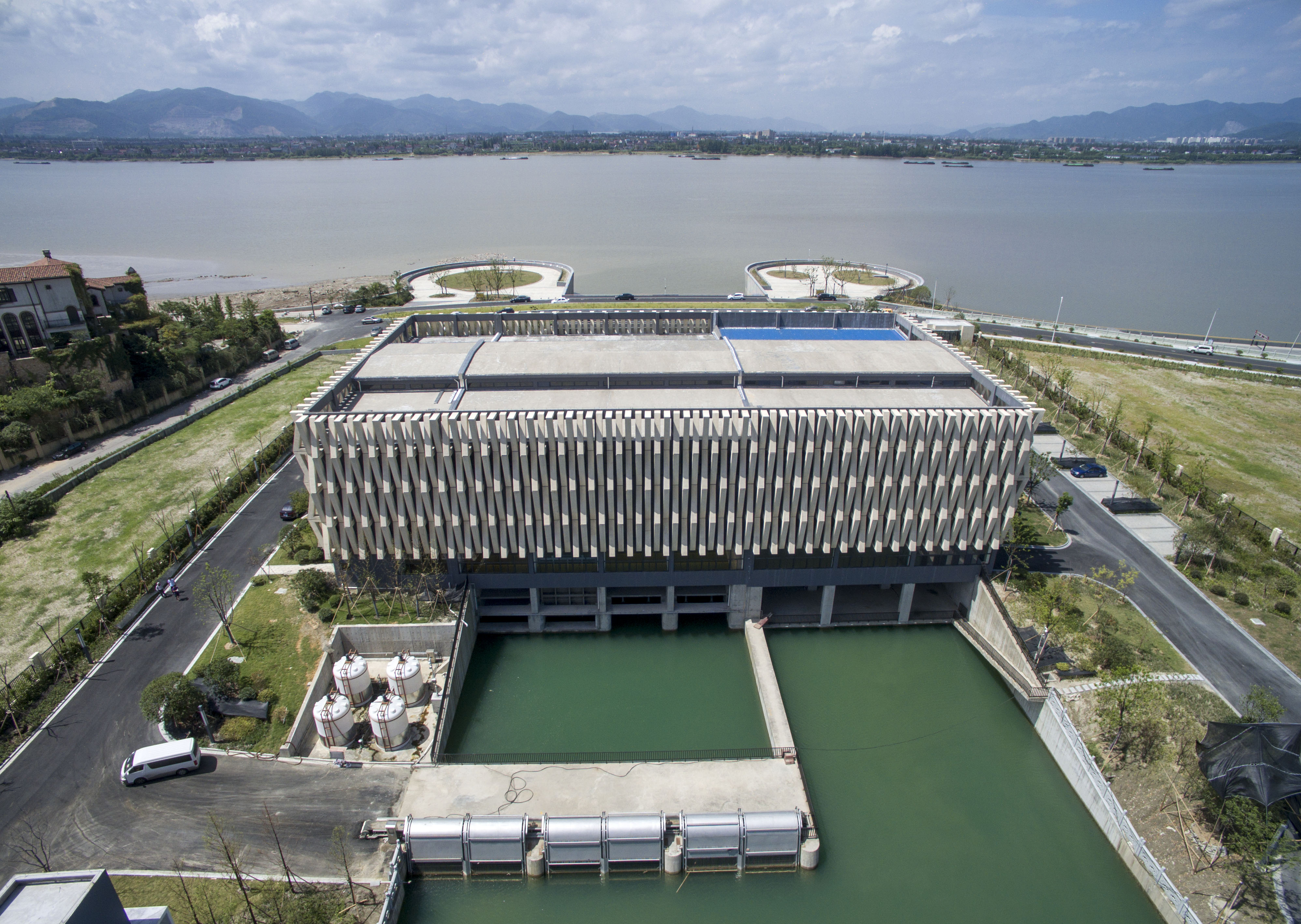 圖為滔滔錢塘江水通過華家排灌站后變為一池碧水。。