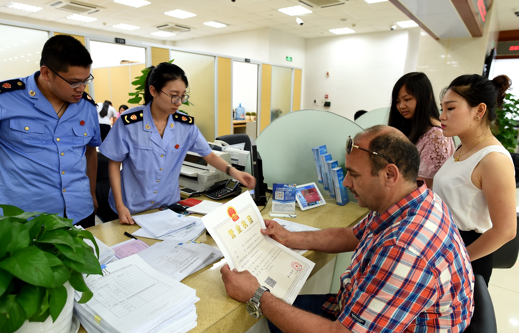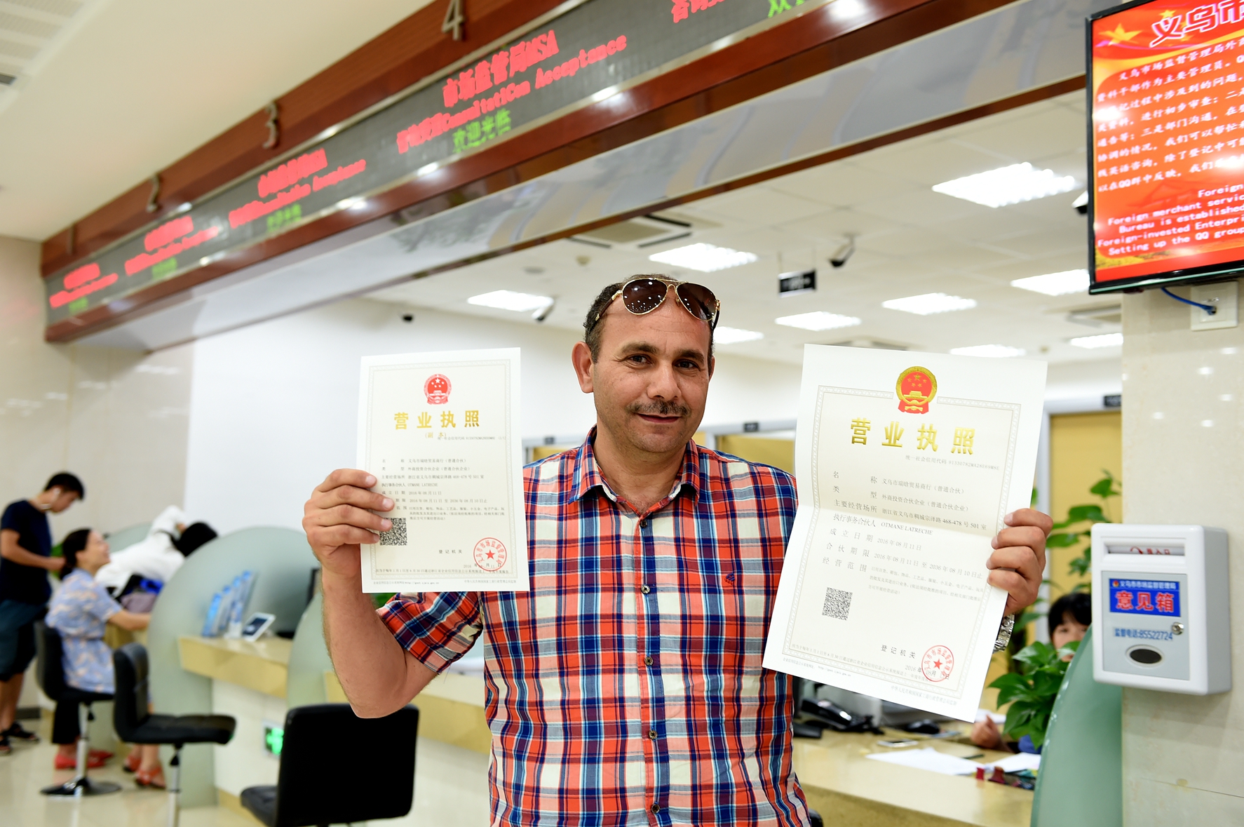 浙江黨建網訊(義烏市委報道組 龔獻明 攝)8月11日,阿爾及利亞客商在義烏申辦營業執照,當天就拿到了。