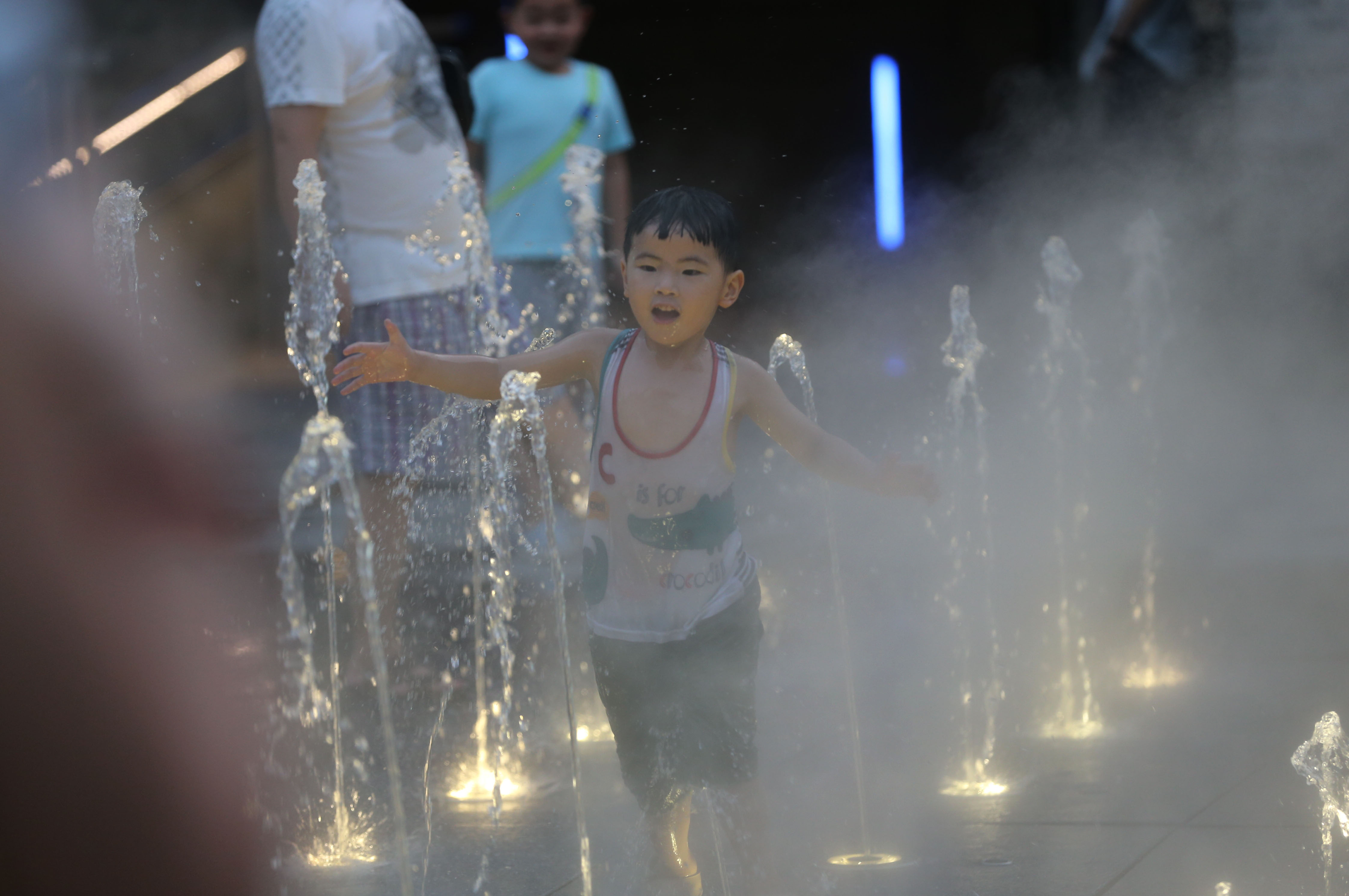 浙江黨建網訊(浙江日報記者 吳新燕 攝)8月16日晚,在杭州湖濱銀泰B區中心小廣場,孩子們在一塊噴水池前歡快嬉戲。噴泉自帶噴霧功能,煙霧裊裊既涼爽又好看,小朋友們穿梭其中玩的不亦樂乎。不過需要提醒的是,噴泉有一定沖力,千萬注意安全。