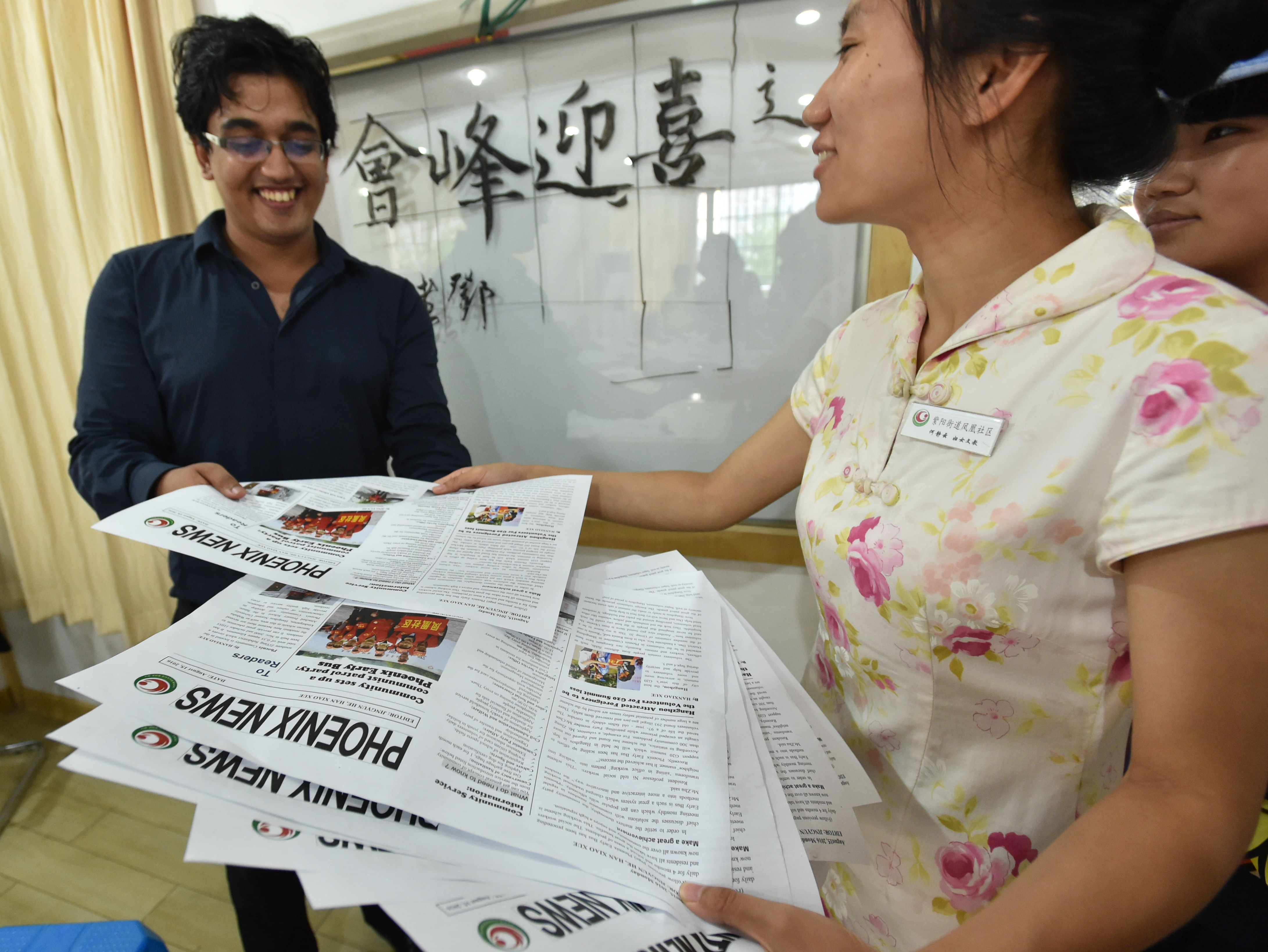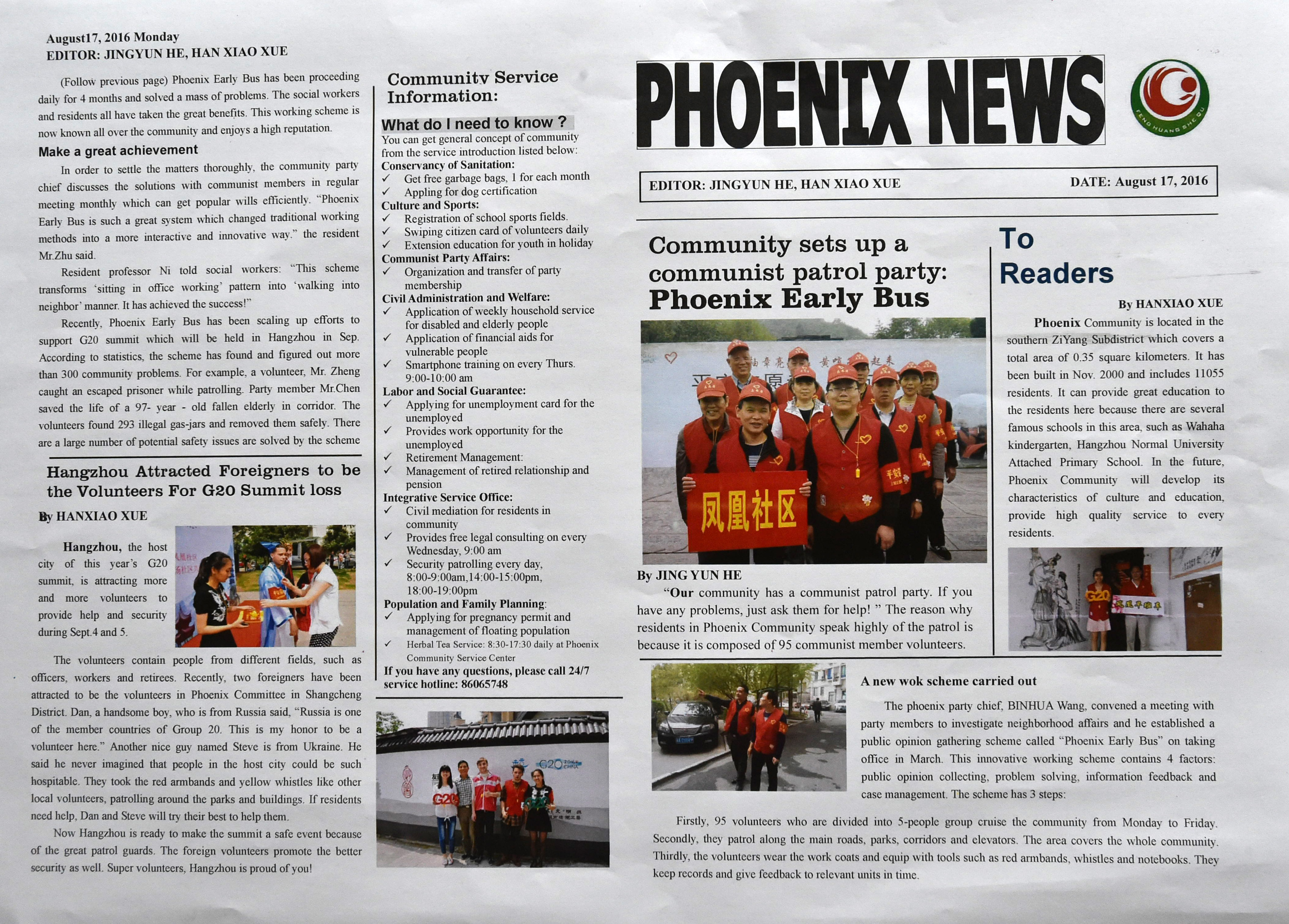 浙江黨建網訊(浙江日報記者 葉寒青 通訊員 葉慧芳 何靜云 攝)8月17日,杭州市紫陽街道鳳凰社區社工編撰的第一份英文版社刊《鳳凰新聞》出刊,發放給蘇丹等外國朋友手中,蘇丹看到內容舉起大拇指連說三個“good”。里面的“鳳凰早班車”涵蓋了社區周邊吃穿住游行等服務類信息,另外還有轄區的平安巡防、社區志愿者等方面的內容。紫陽街道轄區內有外籍人士近200余人,分別居住在鳳凰、春江、甬江等社區,隨著G20峰會的臨近,街道組織社區具有一定英語專業水平社工的力量,特地為外籍人士準備英文社刊,還將陸續開辦第二、第三份社區英文社刊,為轄區內的外籍人士提供更加便利的服務!