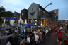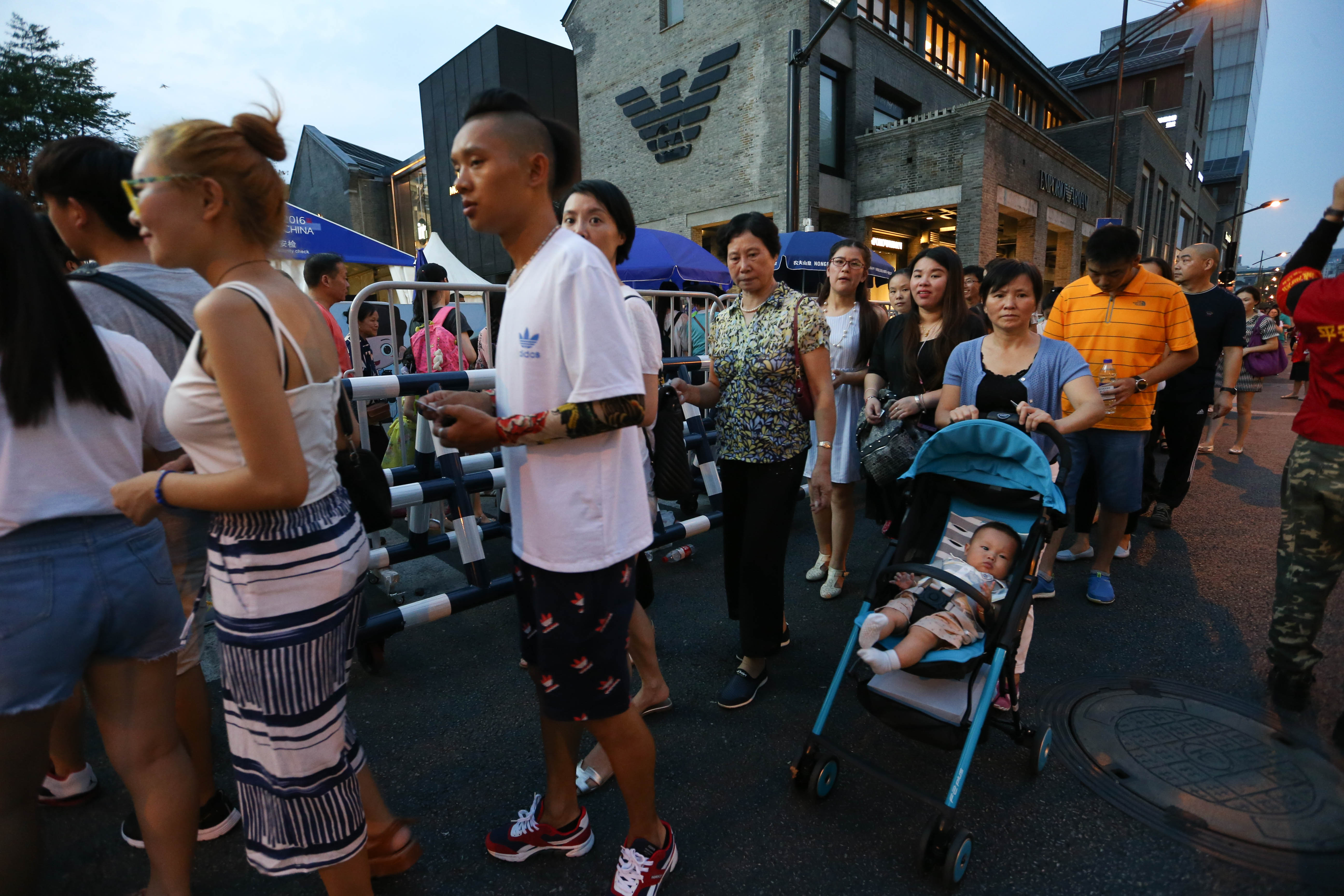 圖為前來觀看西湖音樂噴泉的市民及游客,耐心有序排隊過安檢。
