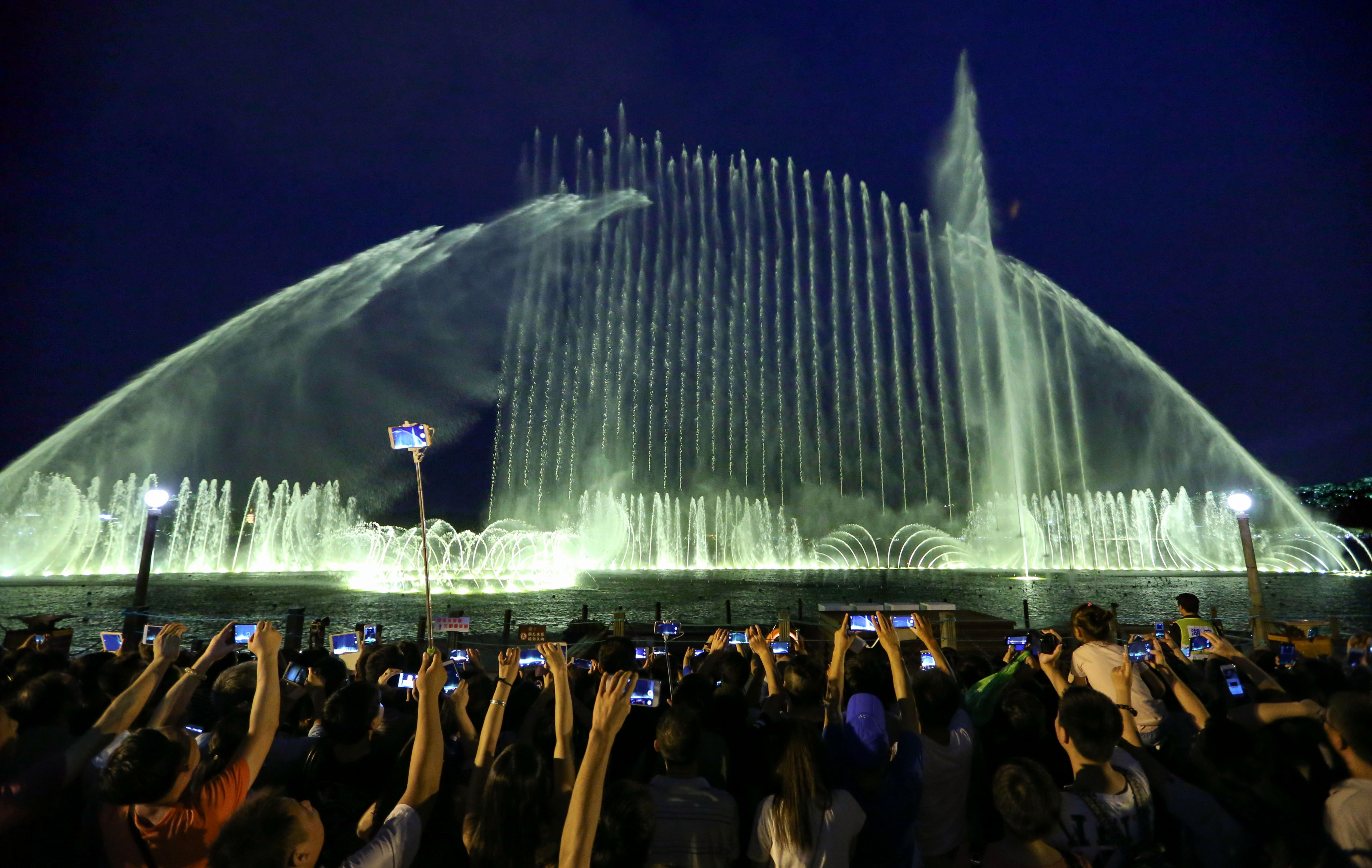 圖為西湖音樂噴泉如常進行,游客、市民紛紛拿出手機拍照,興致盎然。