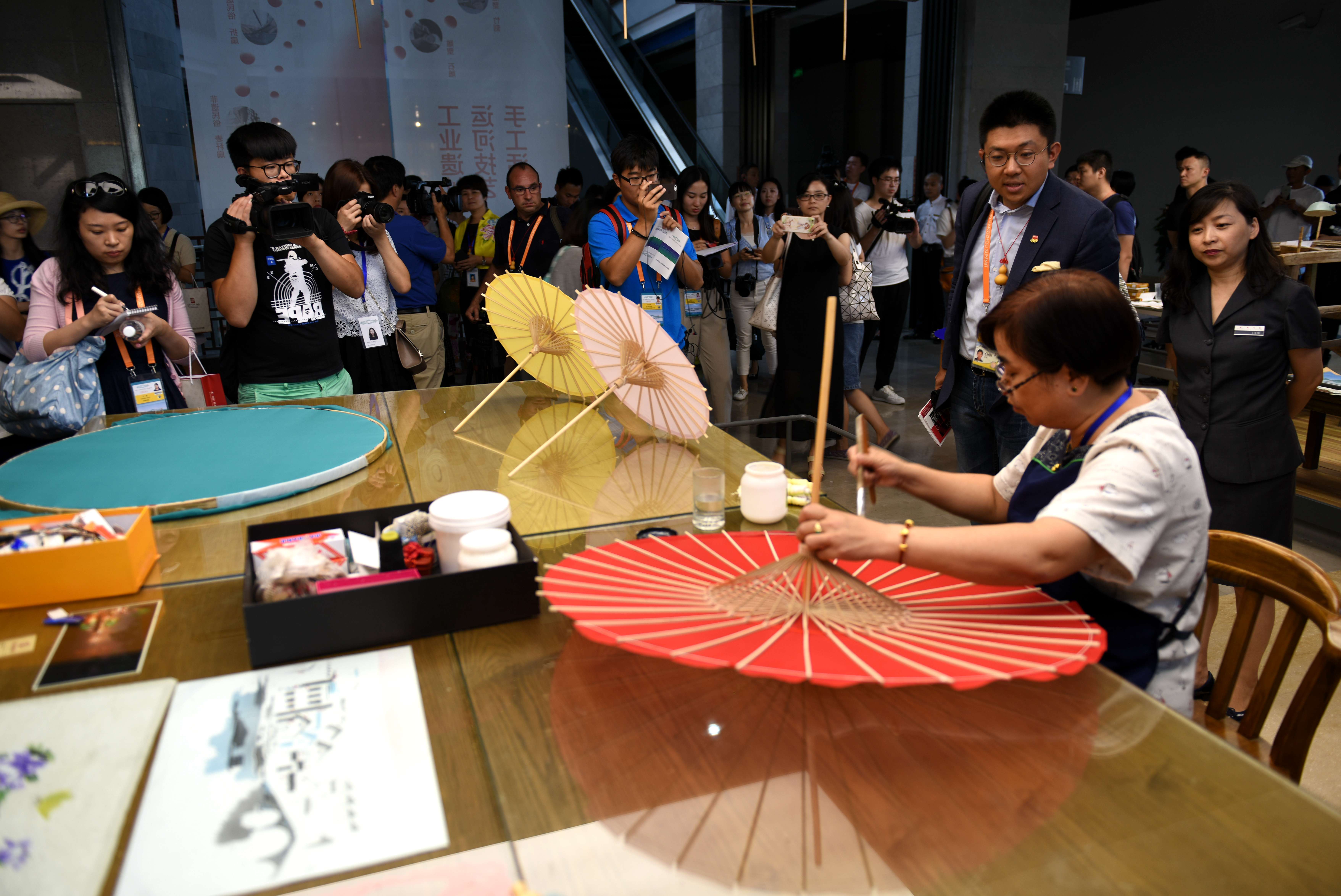 在中國工藝美術博物館,手工藝人向記者們展示西湖綢傘的制作工藝。