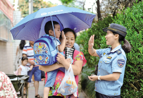 浙江黨建網訊9月6日,南湖區綜合執法大隊建設中隊隊員來到城建幼兒園,孩子們已經認識了這些“城管阿姨”,主動和她們打招呼。連日來,中隊每天來到轄區幼兒園、小學、初中周邊,及時勸導和糾正占道經營等行為,護送孩子們有序放學,確保校園周邊環境整潔有序。(聞人達 周贊 攝)
