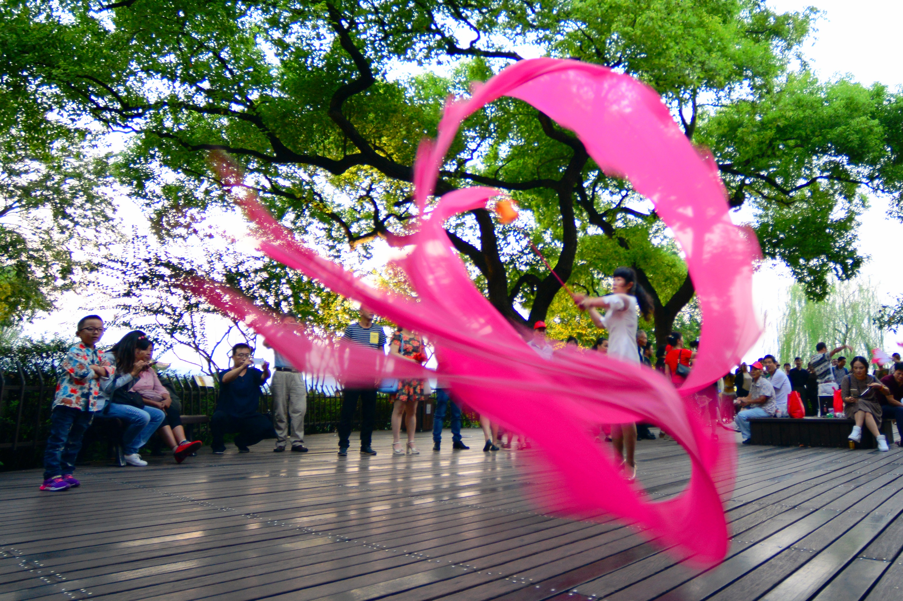 浙江黨建網訊9月18日傍晚,杭州湖濱公園已是人潮如涌。而一位來自湖北的女游客即興舞起了傳統的綢龍,讓人大開眼界。(里爾 攝)