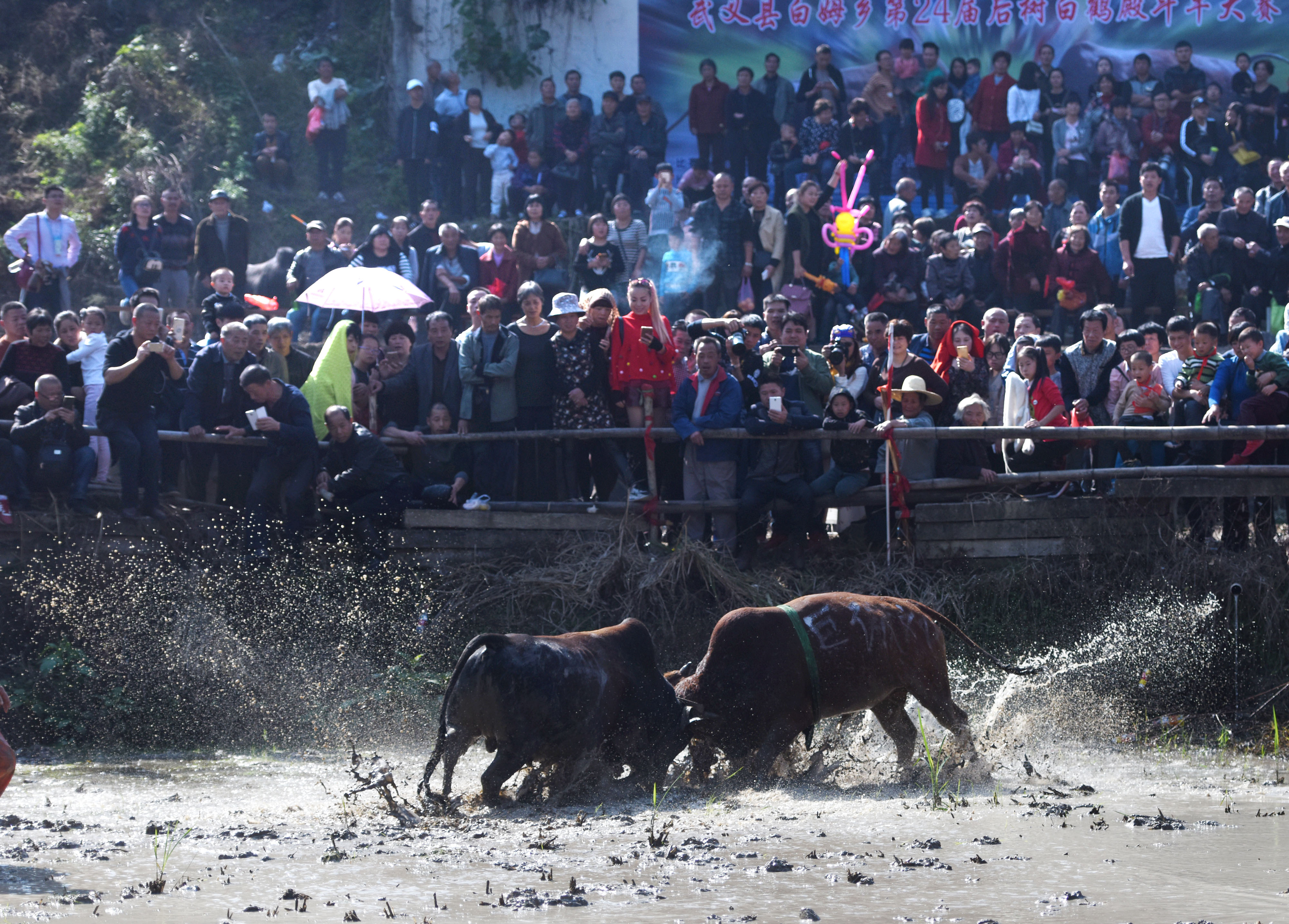 浙江黨建網訊2016年11月5日,武義縣白姆鄉白鶴殿舉行民間斗牛,黃牯牛在水田全力搏殺,現場泥漿四濺。當地斗牛有1000多年歷史,來自全縣各地的44頭彪悍善斗的黃牯牛,通過抓鬮捉對撕殺,決出金、銀、銅獎。(張建成 攝)
