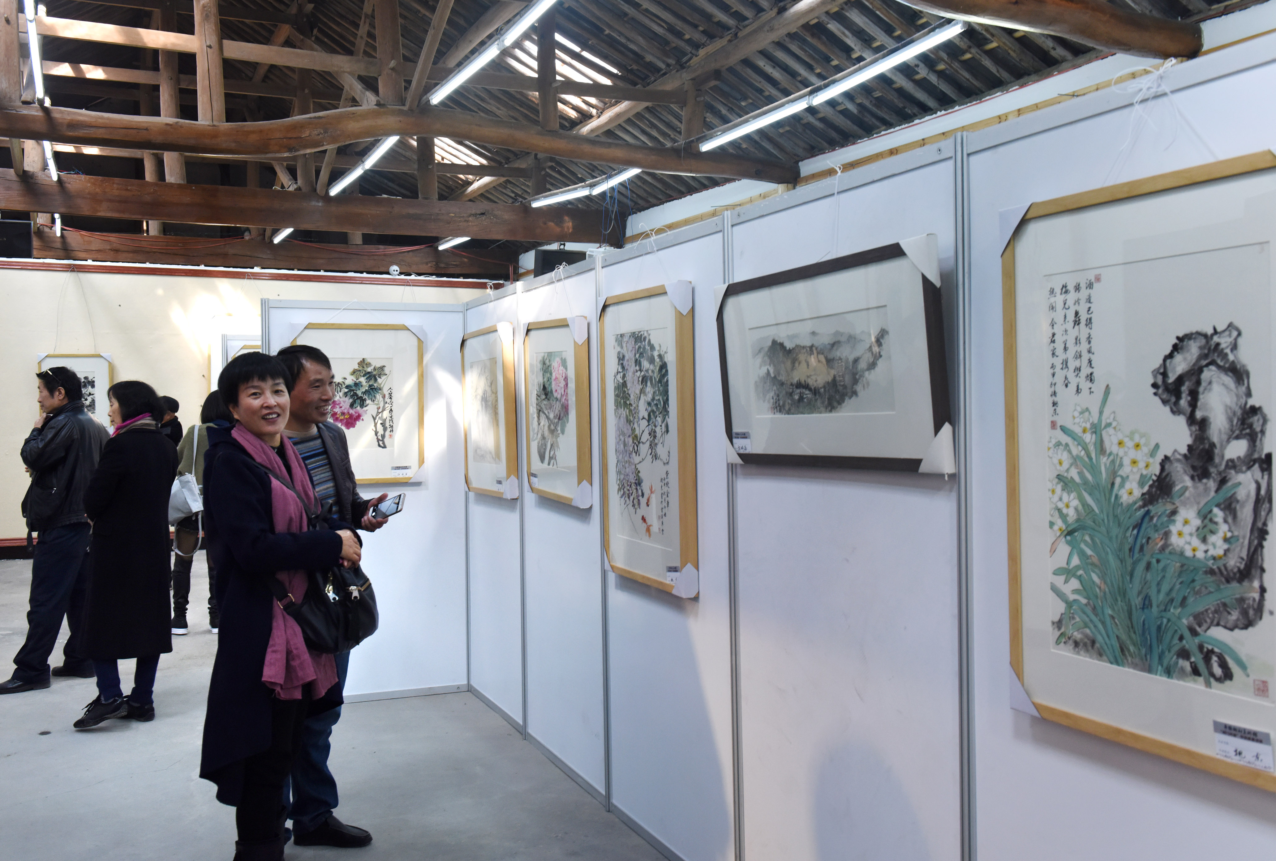 當日,位于武義縣深山坳里的王宅鎮(zhèn)平頭村跟過節(jié)一樣,沈保良、魏東、鄭有軍、杜恩華、程瑞鑫五位實力派畫家及畫友的數(shù)百幅畫作,除了掛滿村美術(shù)館外,村里土坯墻、河邊及游步道上也布置了大量畫作,與清澈的河水、碧綠青山、毛竹吊腳亭、水車融為一體,又構(gòu)成了一幅栩栩如生的美麗鄉(xiāng)村佳作。(張建成 攝)