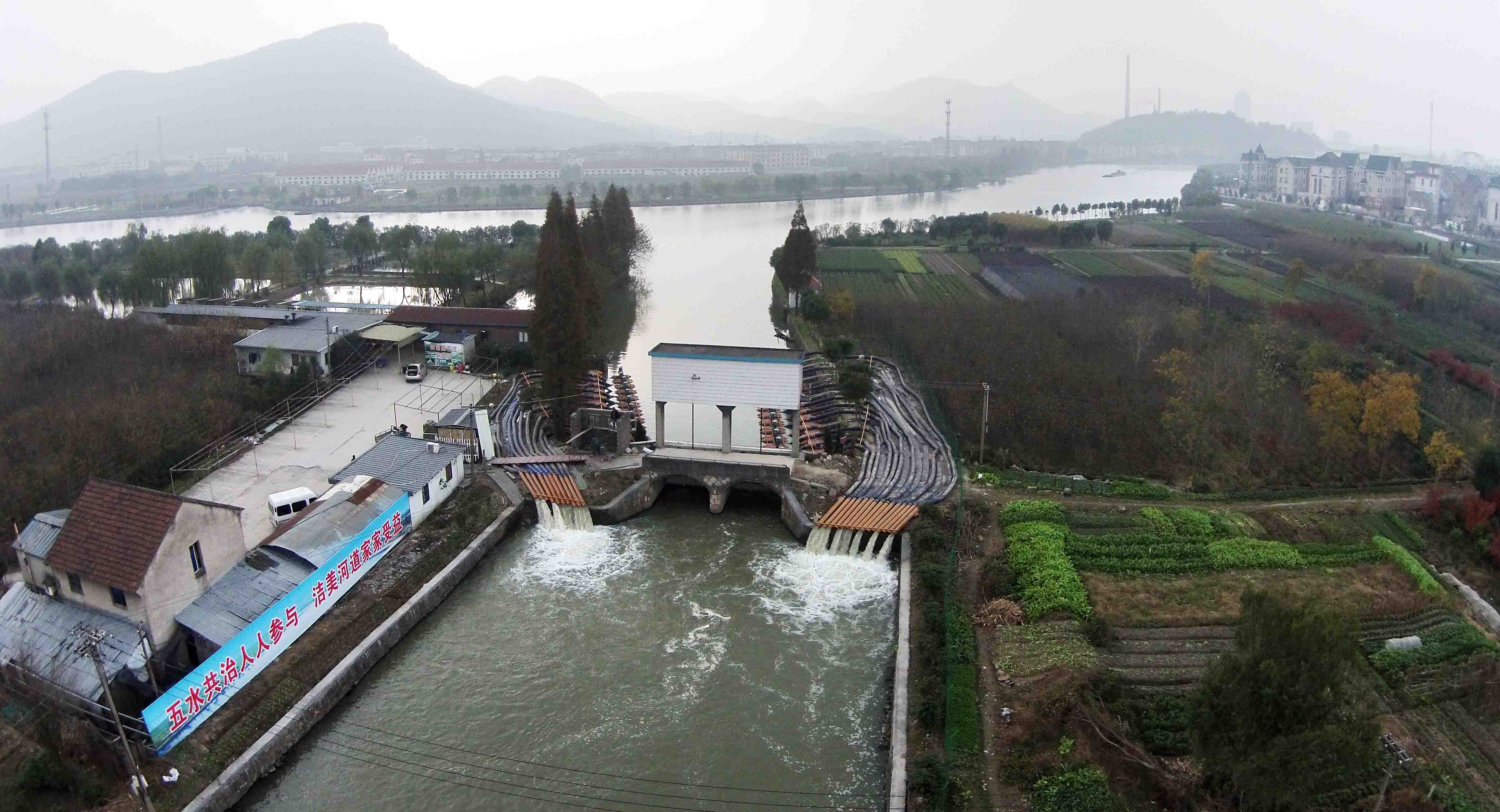 浙江黨建網訊(浙江日報記者 邵全海 通訊員 蔡卡特 攝)近日,杭州蕭山區重點工程——衙前鎮引配水工程已完成新林周直河南端的胡家塔閘外側25臺浮桶式混流泵和配套機房建設,將西小江清水引入官河。該工程將進一步改善蕭山區境內水系水質,深化“五水共治”成效。