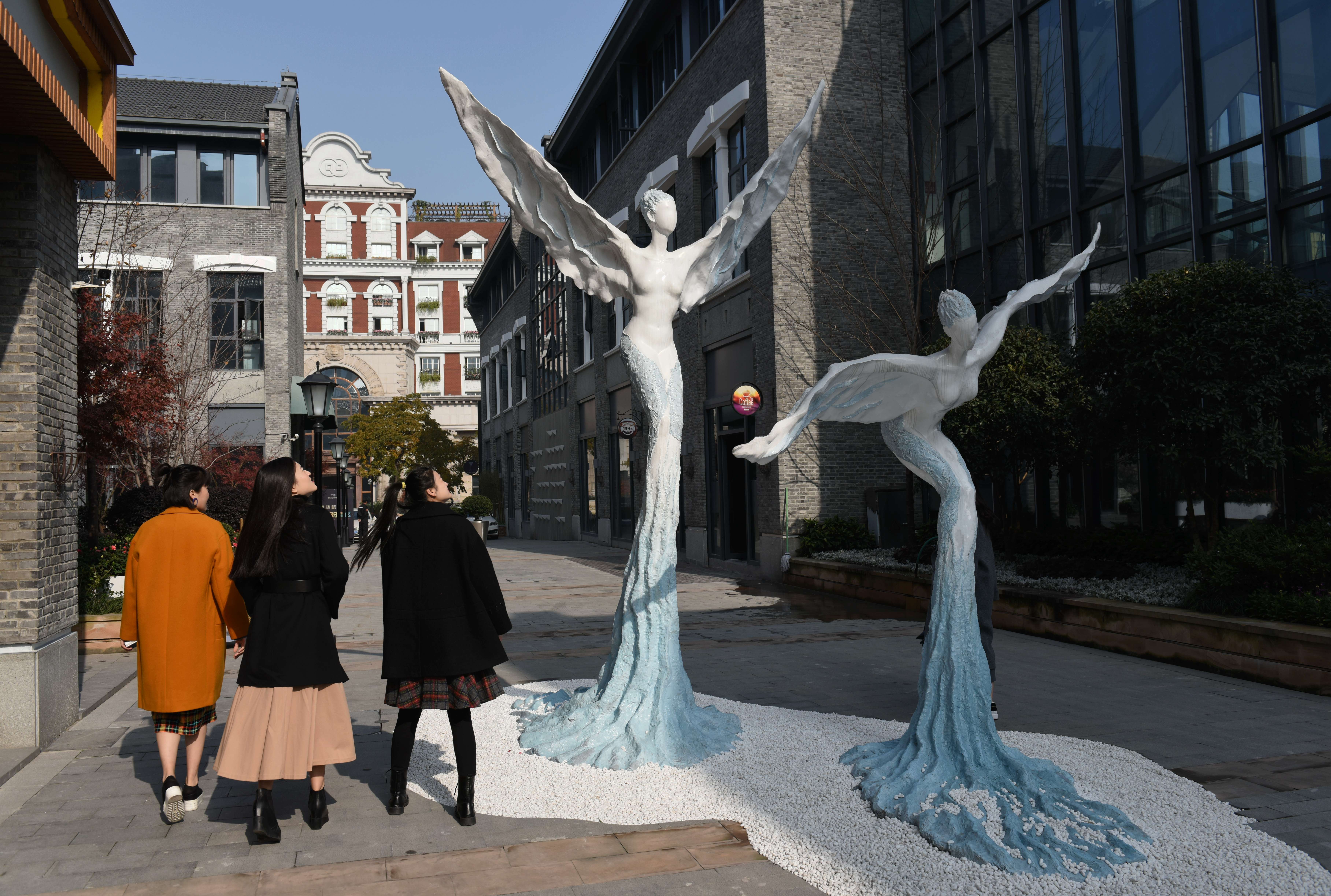 圖為12月7日,幾位游客路過街區(qū)的一個(gè)主題雕塑。