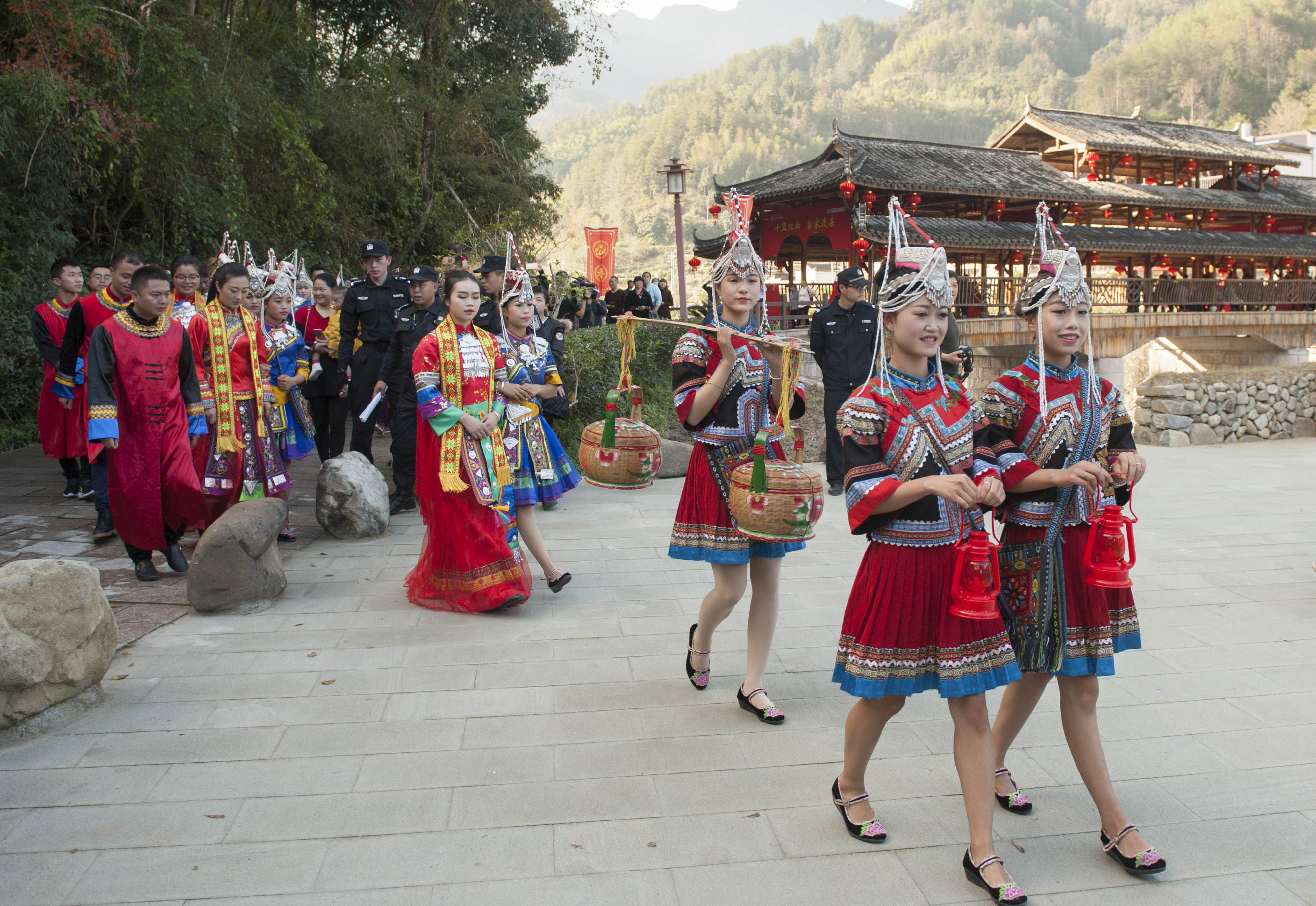 當日,景寧畬族自治縣畬鄉之窗——大均鄉大均村十里紅妝喜迎畬家渡親節,十對來自各地的畬漢新人,在畬鄉人民的祝福聲中永結同心,喜結良緣。(李肅人 攝)