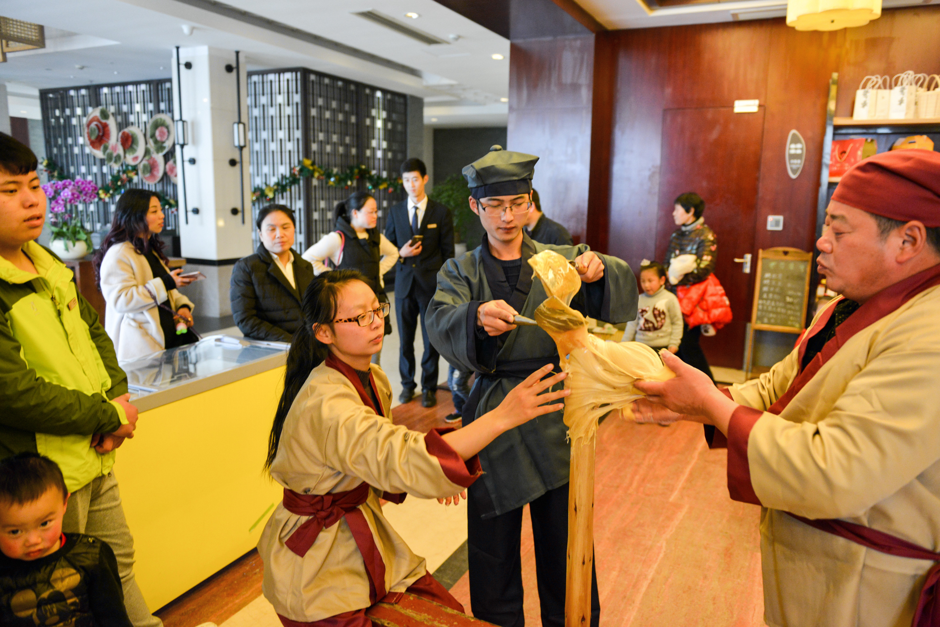 浙江黨建網訊1月1日,長興縣水口鄉徽州莊村的一家民宿內,游客正在體驗手工制作麥芽糖、雞蛋餅等民俗活動。(譚云俸 張澤民 攝)