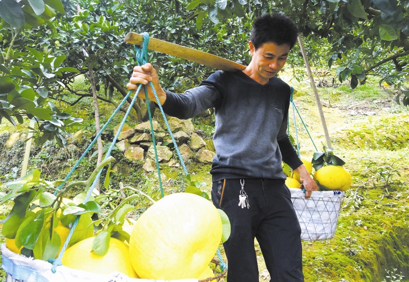 1月8日,玉環縣清港鎮垟根村果農江志正挑著一擔剛采摘下來的文旦,等著客戶上門前來收購。江志正說,如今文旦每公斤批發價就有10.4元,而去年同期每公斤只有2元,這次他家文旦產量約有2萬公斤,他的收入可達20萬元左右。據了解,受去年年初寒潮影響,玉環文旦產量減少20%左右,價格自然也就上去了。(吳達夫 攝)