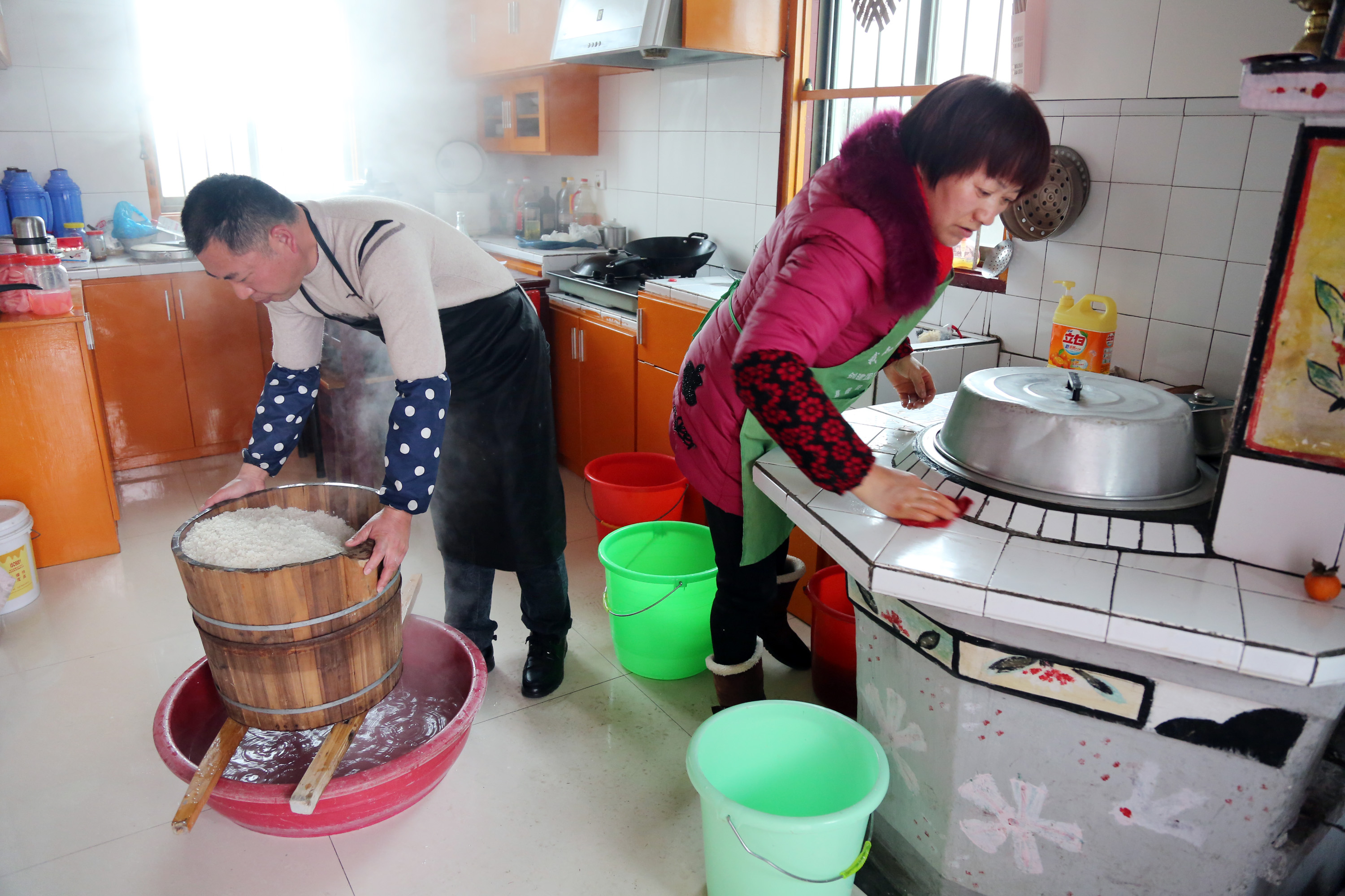 浙江黨建網(wǎng)訊1月11日,嘉善縣西塘鎮(zhèn)禮廟村有著10多年釀酒經(jīng)驗(yàn)的楊師傅在鄰居家?guī)兔︶勚泼拙啤W葬劽拙埔?jīng)過(guò)浸米、熱缸、蒸飯、拌酒曲、48小時(shí)后灌水等步驟,等上半個(gè)多月,到農(nóng)歷春節(jié)時(shí),30公斤糯米就釀成了75公斤左右的香甜米酒。(胡凌翔 高敏慧 攝)