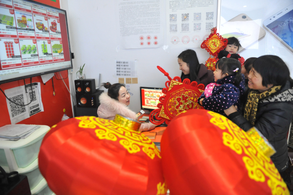 1月12日,村民在臨安市天目山鎮白鶴村農村淘寶點領取網購的年貨。春節臨近,天目山鎮各農村淘寶店一片忙碌。(胡劍歡 夏樹妹 攝)