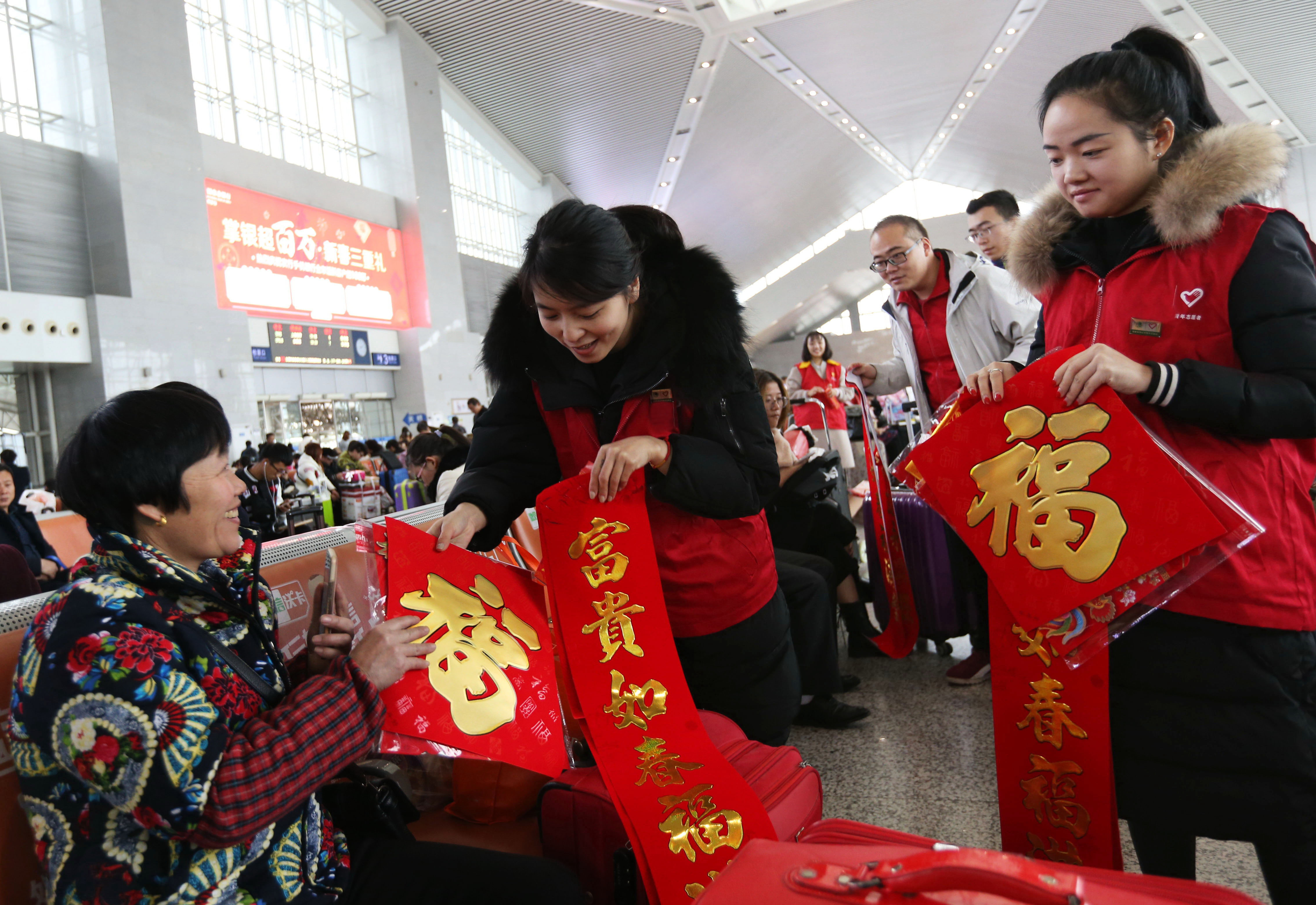 浙江黨建網訊1月13日,在溫州火車南站,“紅十三愛心社”志愿者們為返鄉旅客送春聯。當日是春運第一天,溫州“紅十三愛心社”組織青年志愿者們來到溫州火車南站,為返鄉農民工們送去春聯、手套等新年禮物,讓他們帶“福”回家過年。(蘇巧將 王雪 攝)