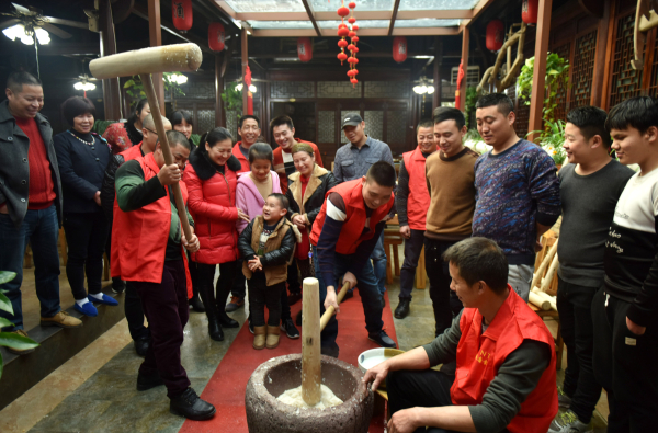 浙江黨建網(wǎng)訊1月15日,武義南唐食府打年糕專業(yè)隊隊員喊起號子、手掄木錘,與市民一起打年糕、爆米花。
