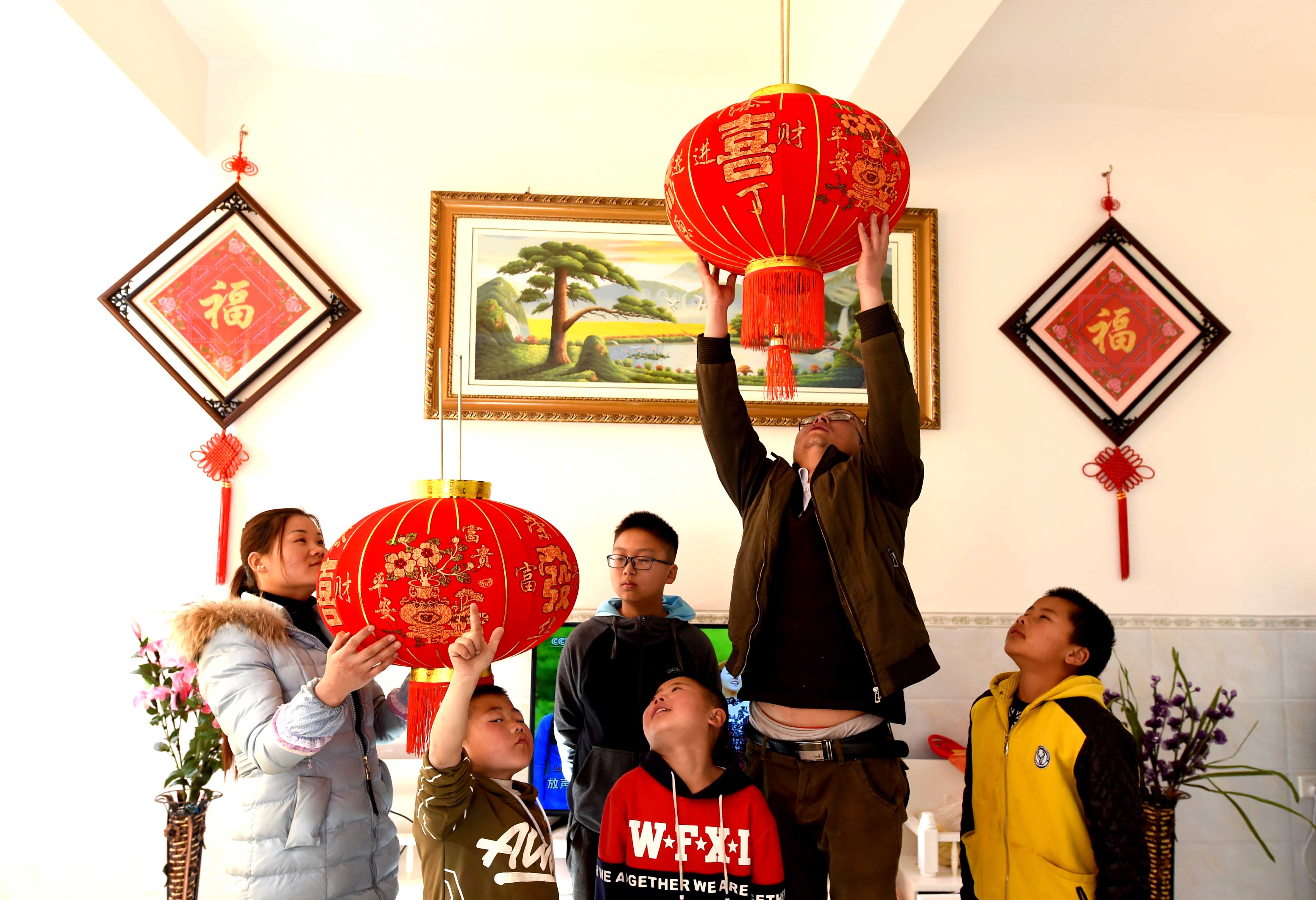 1月15日,云南省尋甸回族彝族自治縣唐子村的一戶村民在新居內(nèi)懸掛紅燈籠。