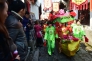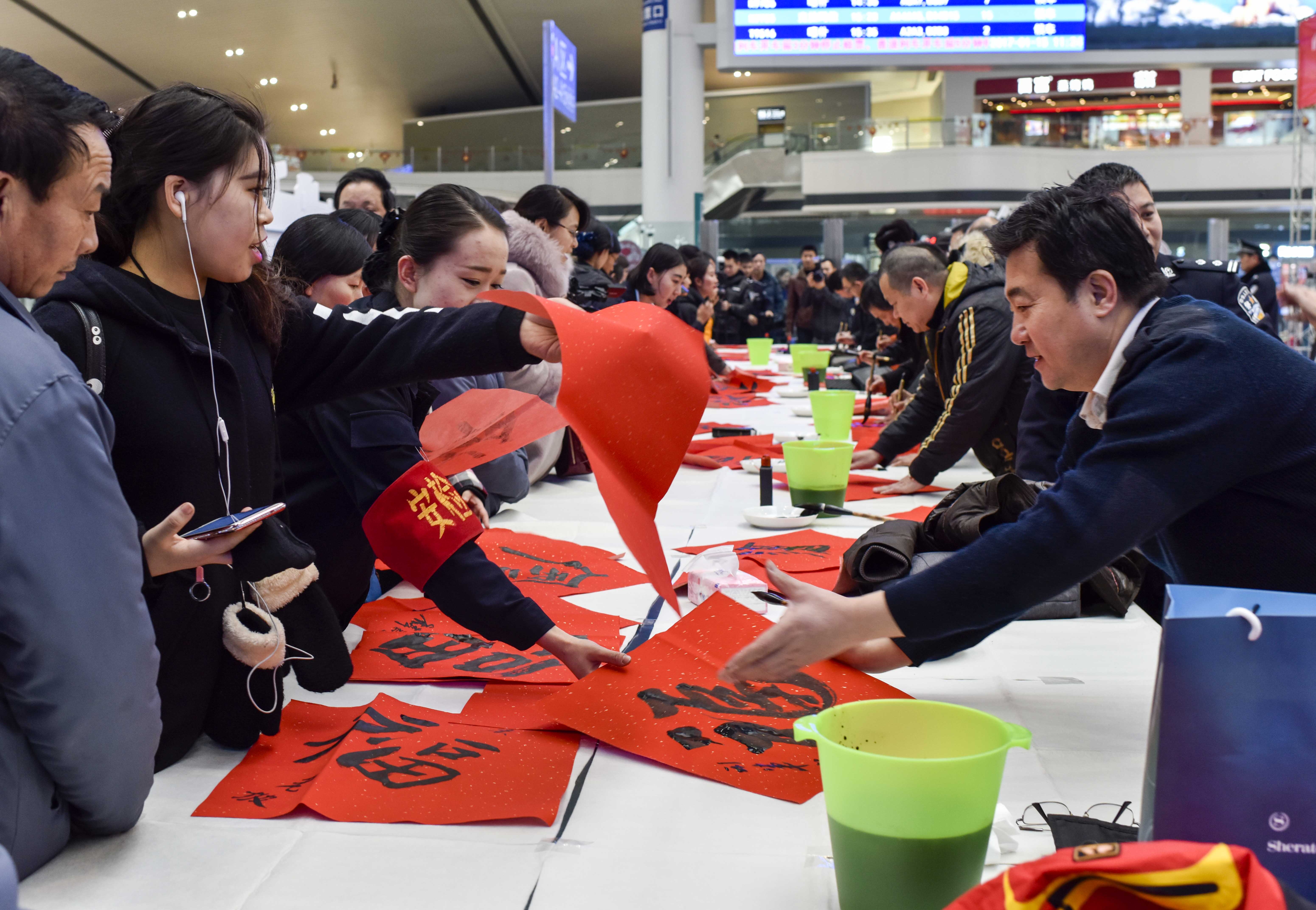 1月15日,書法家們在烏魯木齊站候車大廳內為旅客寫“福”送“福”。