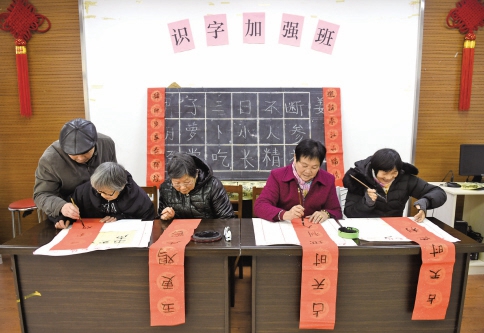 1月17日,嘉興經濟技術開發(fā)區(qū)城南街道金穗社區(qū)識字加強班2016秋季班結課儀式上,學員們認真書寫春聯(lián)。這些學員最大的已經80歲,有的沒上過學也不認識字。在識字加強班志愿者老師近兩年的指導下,老人們已經學會很多字了。(朱駿 陸春卉 攝)