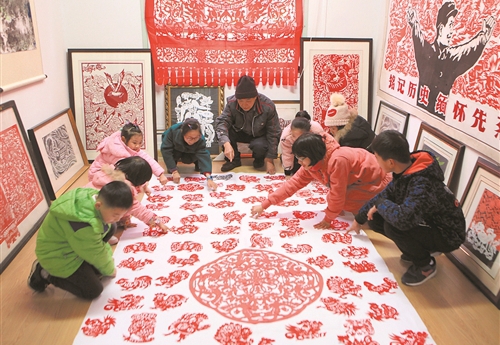 這幾天,為迎接丁酉雞年的到來,溫嶺剪紙藝人林榮文和學生一起剪出了數百只形態各異、生動可愛的“雞”剪紙作品。(周學軍 攝)