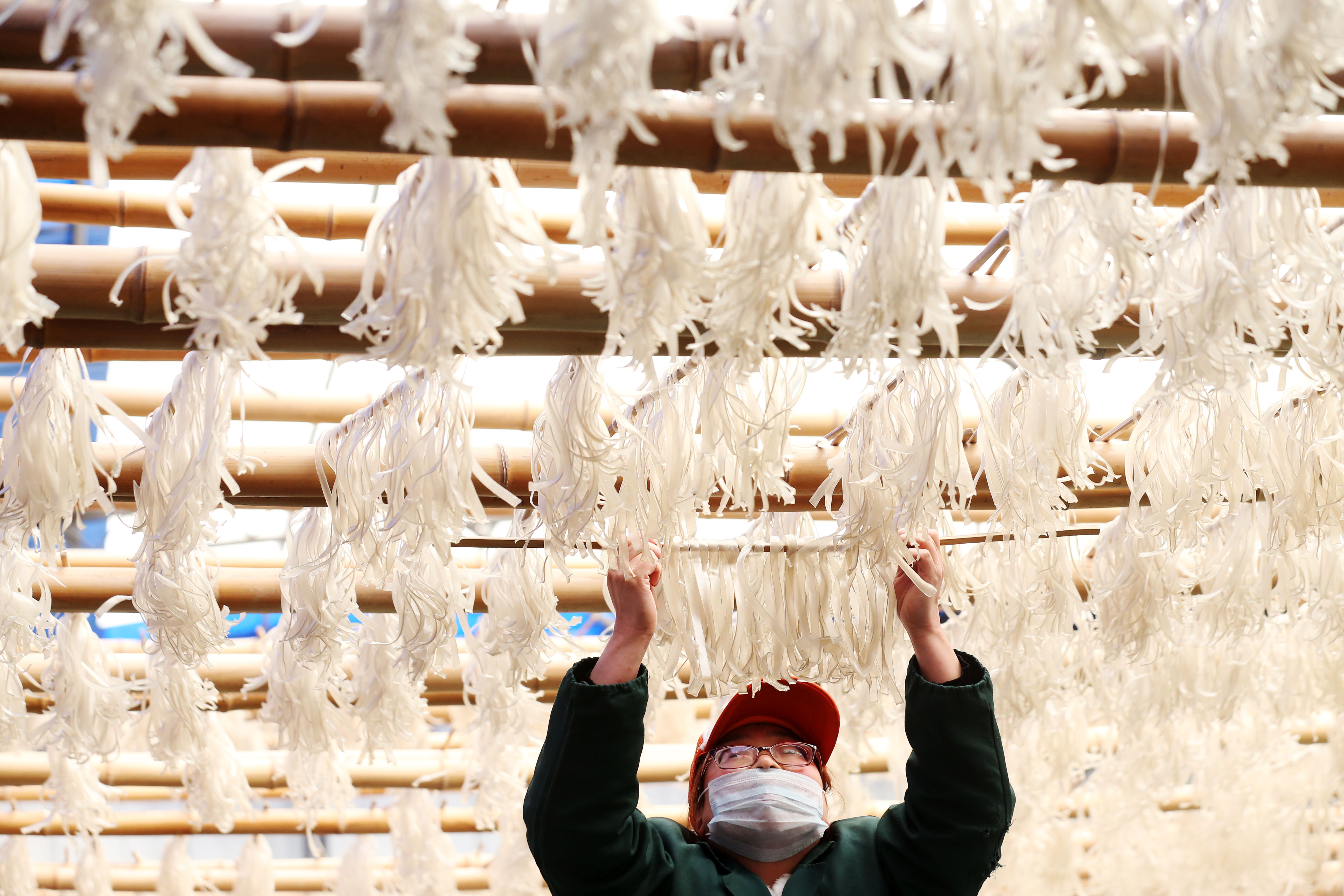 1月17日,在重慶市黔江區(qū)城東街道一薯粉加工廠,工人在晾曬手工制作的紅薯粉。這種沿用古法手工制作的紅薯粉、馬鈴薯粉,是重慶市黔江區(qū)人必備的年貨。(楊敏 攝)