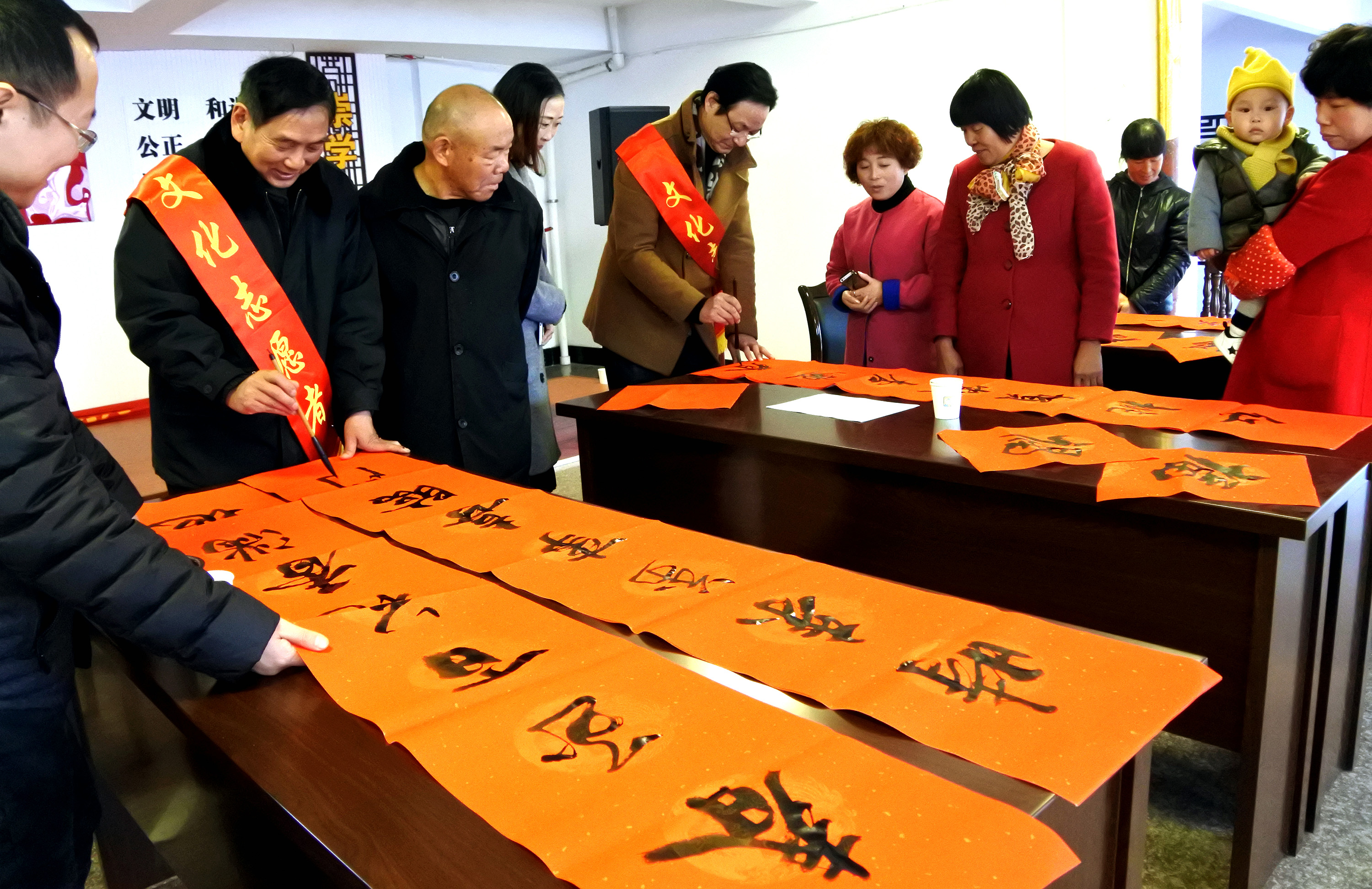 1月18日,溫嶺文藝志愿者在溫嶺山河村文化禮堂開展2017“金雞報(bào)曉”義務(wù)書春聯(lián)活動。