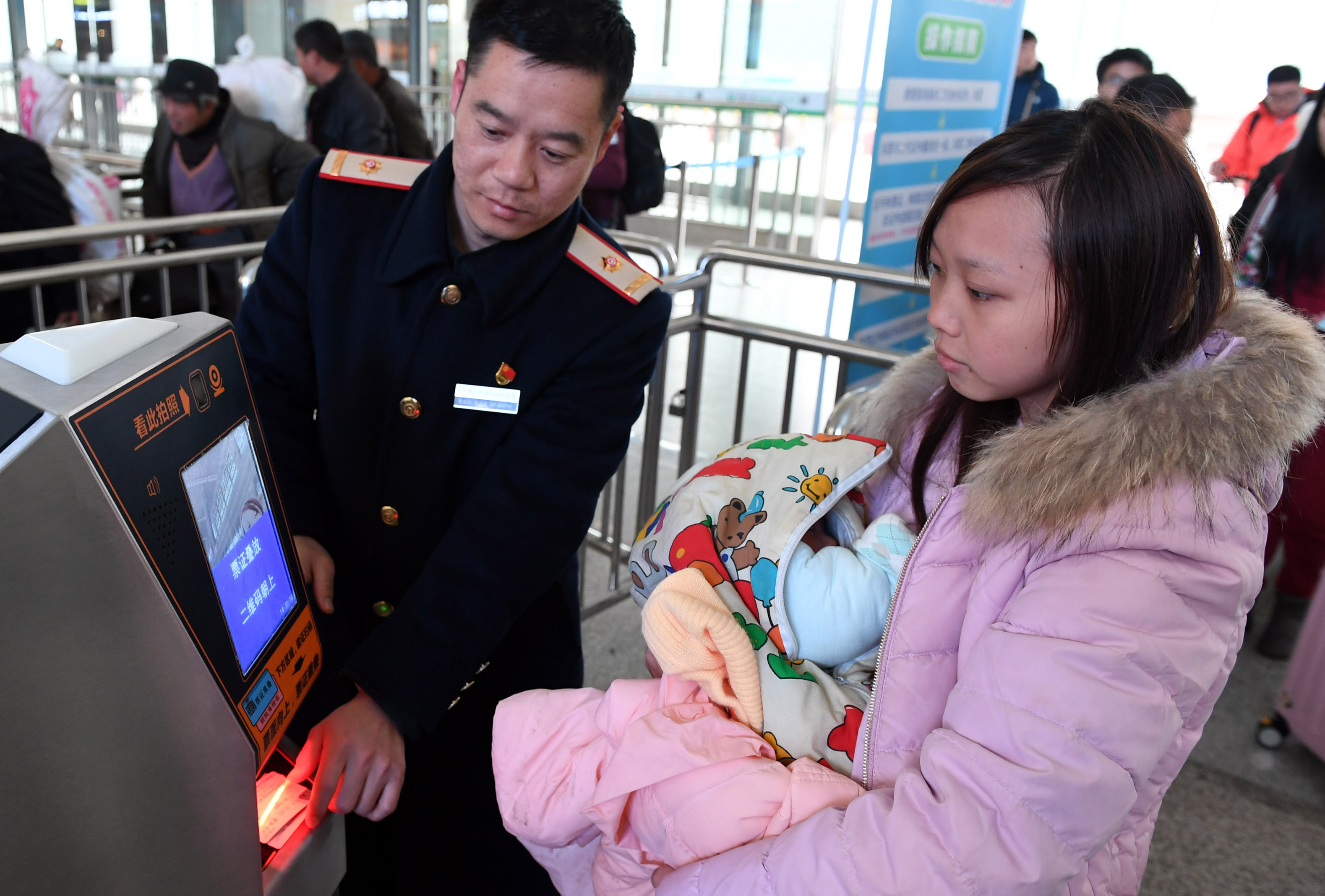 1月18日,一名懷抱小孩的旅客在工作人員協(xié)助下,在自動驗證檢票機前“刷臉”進站。
