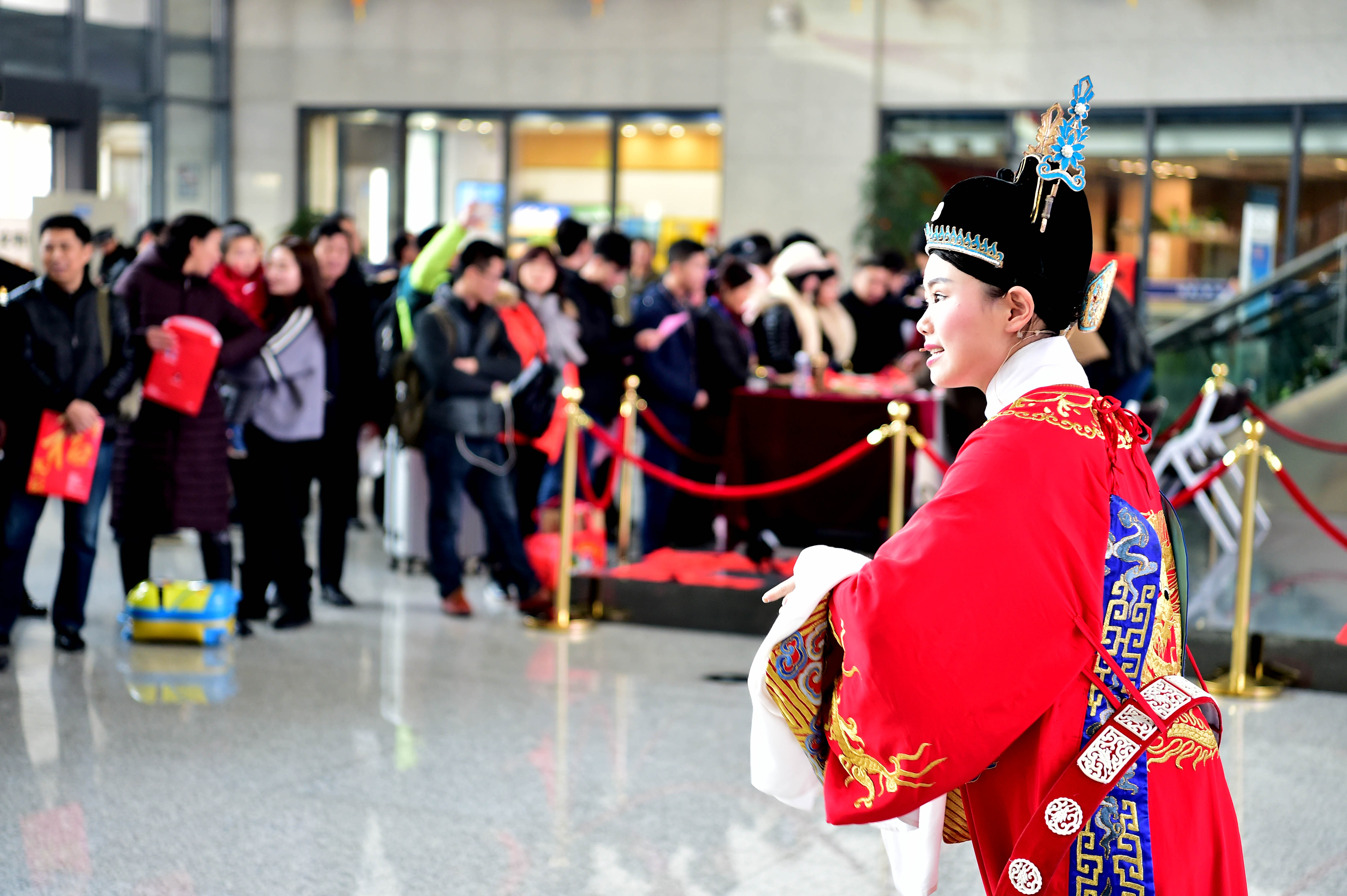 1月22日,安徽省黃梅戲劇院的演員在合肥高鐵南站表演黃梅戲節目。當日,安徽合肥高鐵南站邀請安徽省黃梅戲劇院的演員來到候車室,為旅客表演傳統黃梅戲劇目,讓旅客們在緊張的旅途之中放松身心。(劉軍喜攝)