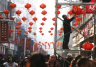 圖為工人在懸掛大紅燈籠,營(yíng)造濃濃的年味。