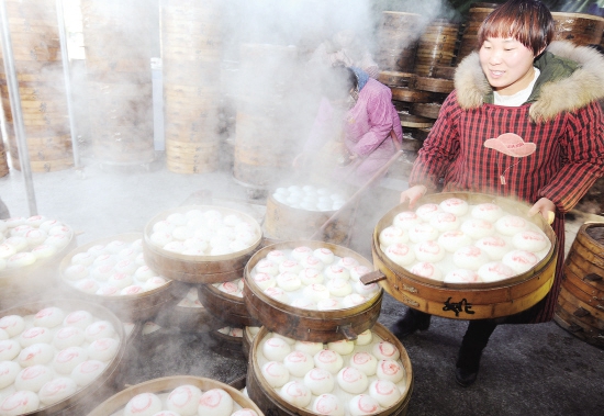 1月23日,金華金東區赤松鎮仙橋婺源饅頭店里熱氣騰騰,10多人忙著趕制春節饅頭。店主姚國憲介紹,春節期間是一年中饅頭需求高峰,一天要做2萬至5萬只。饅頭夾扣肉,是大家喜愛的吃法。圓圓的金華饅頭,寓意著團團圓圓、蒸蒸日上、吉祥如意。(時寬兵 攝)