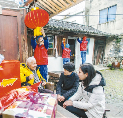1月22日,志愿者正在象山縣丹西街道97歲高齡的抗戰(zhàn)老兵周兆洵家掛燈籠、貼對聯(lián)。當日,寧波象山縣民政局和小草象山服務隊的志愿者們走進抗戰(zhàn)老兵家,提前送上節(jié)日的問候。(陳斌 攝)