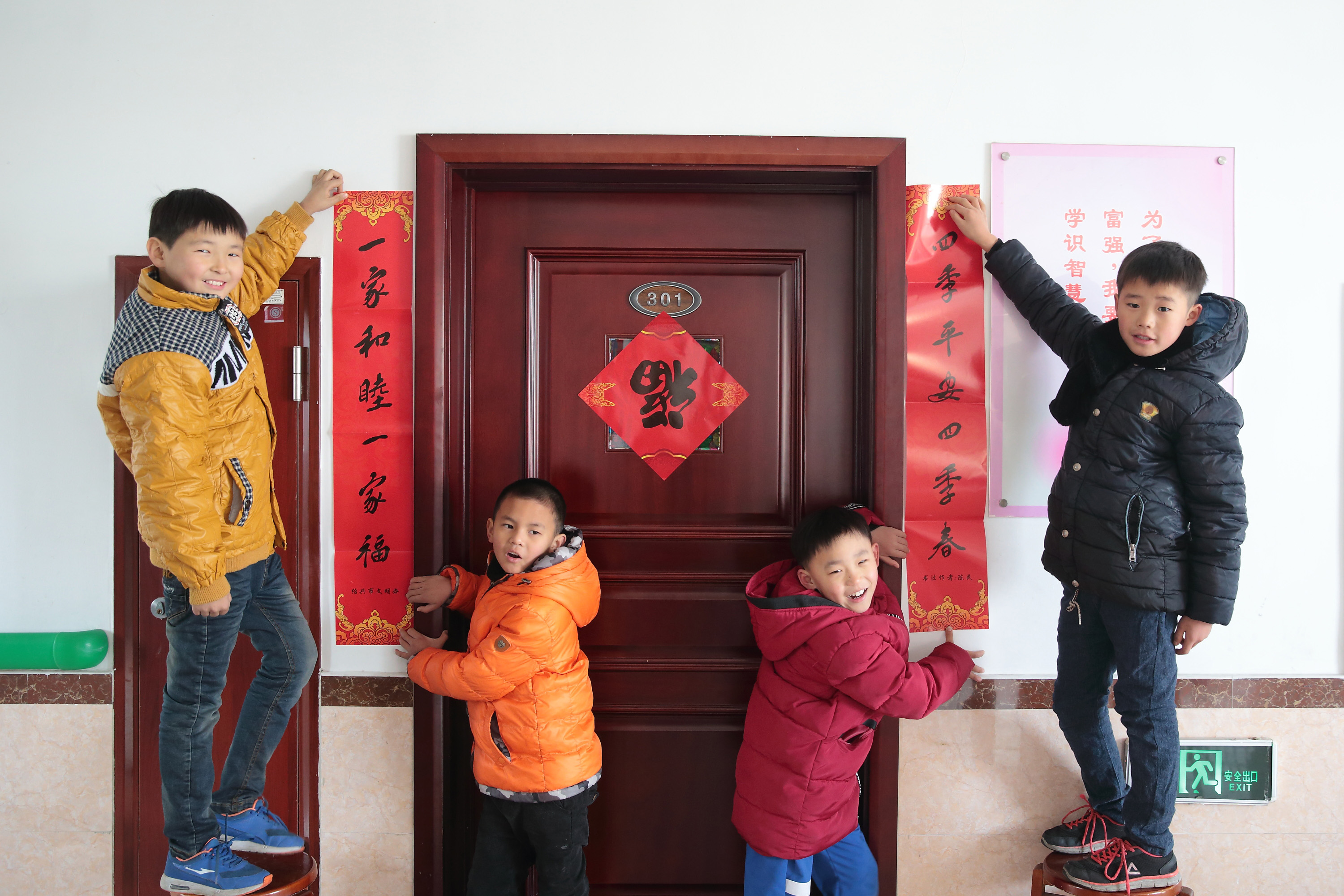 浙江黨建網訊1月25日,住在海亮幸福院內的孩子在房間外貼對聯。當日,留住在海亮幸福院內的18名孩子格外高興,他們跟著愛心媽媽一起貼對聯,掛燈籠,迎接新年。幸福院中共生活著161名孩子,他們都是浙江海亮慈善基金會從全國各地招募撫養的孤兒,分別來自云南、內蒙、甘肅等十余個省份,春節期間部分孩子返回老家與監護人過年(孩子往返費用由海亮承擔),留下18名孩子,他們將在海亮歡度2017年新春。(郭斌 潘金生 攝)